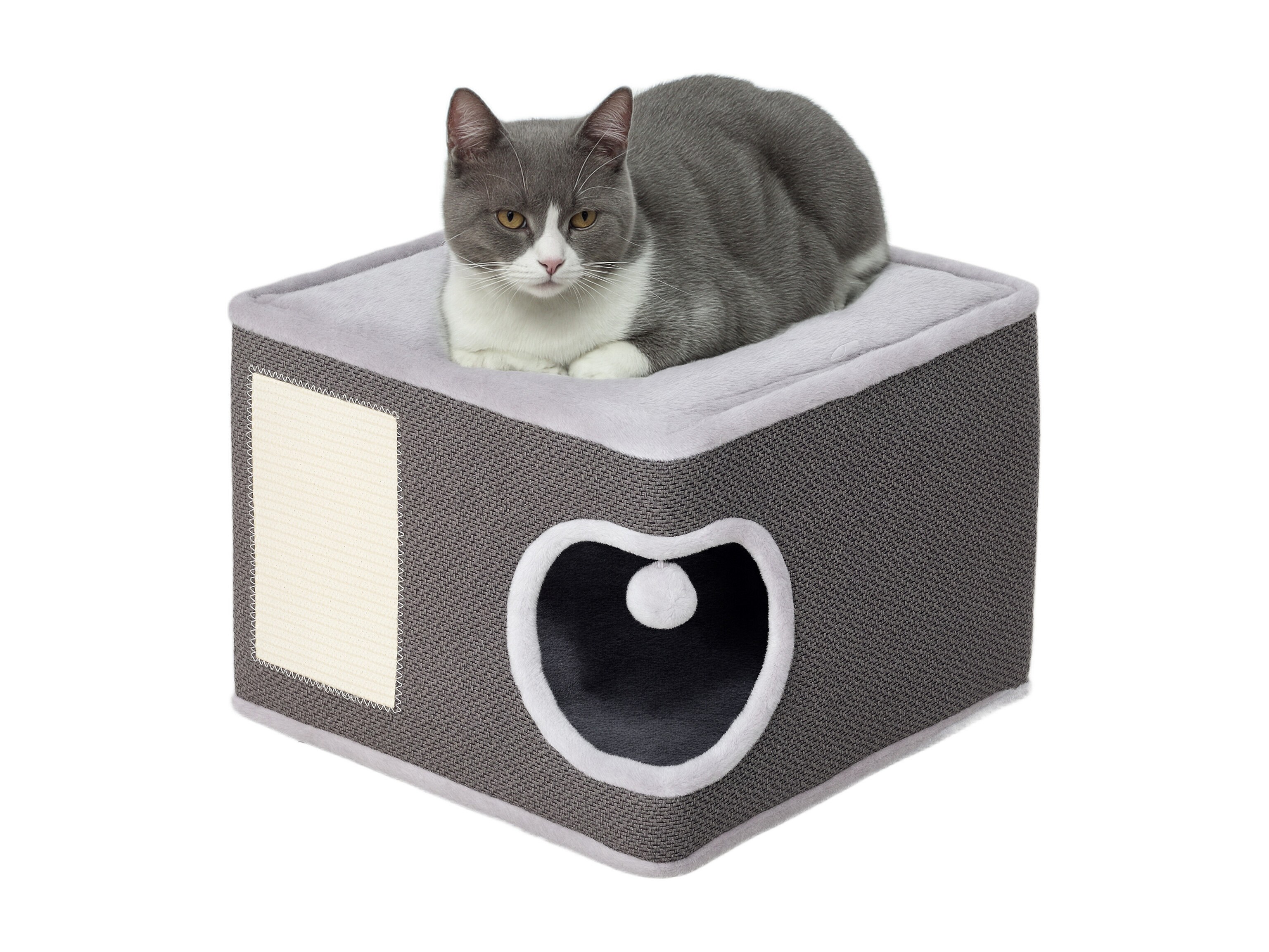Panier niche griffoir grattoir 4 en 1 - 2 coussins, pompon - sisal naturel peluche gris