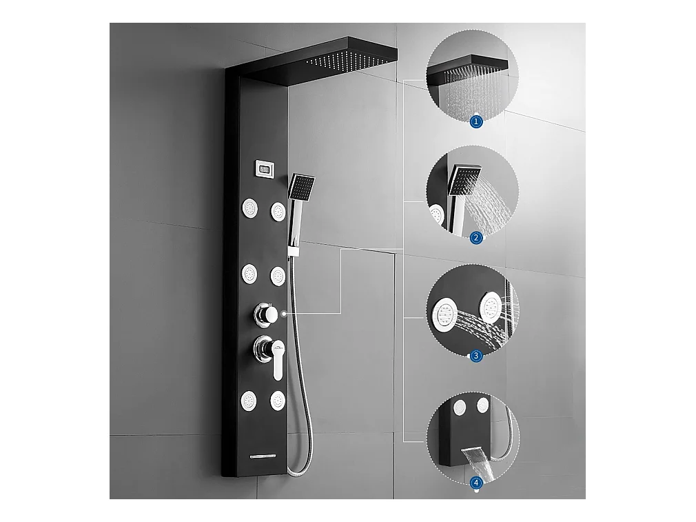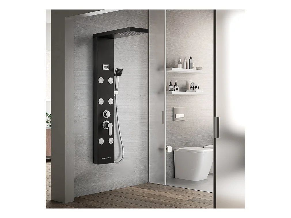 Panneau Colonne de Douche Hydromassante Noir Panneau Douche Kit en Acier Inox avec 6 Grandes Buses Massants Ensemble Douche avec Écran LCD-EU Modèle