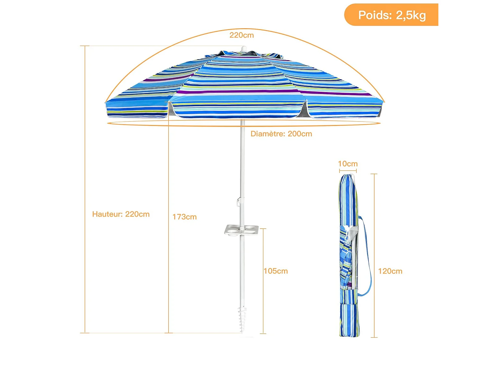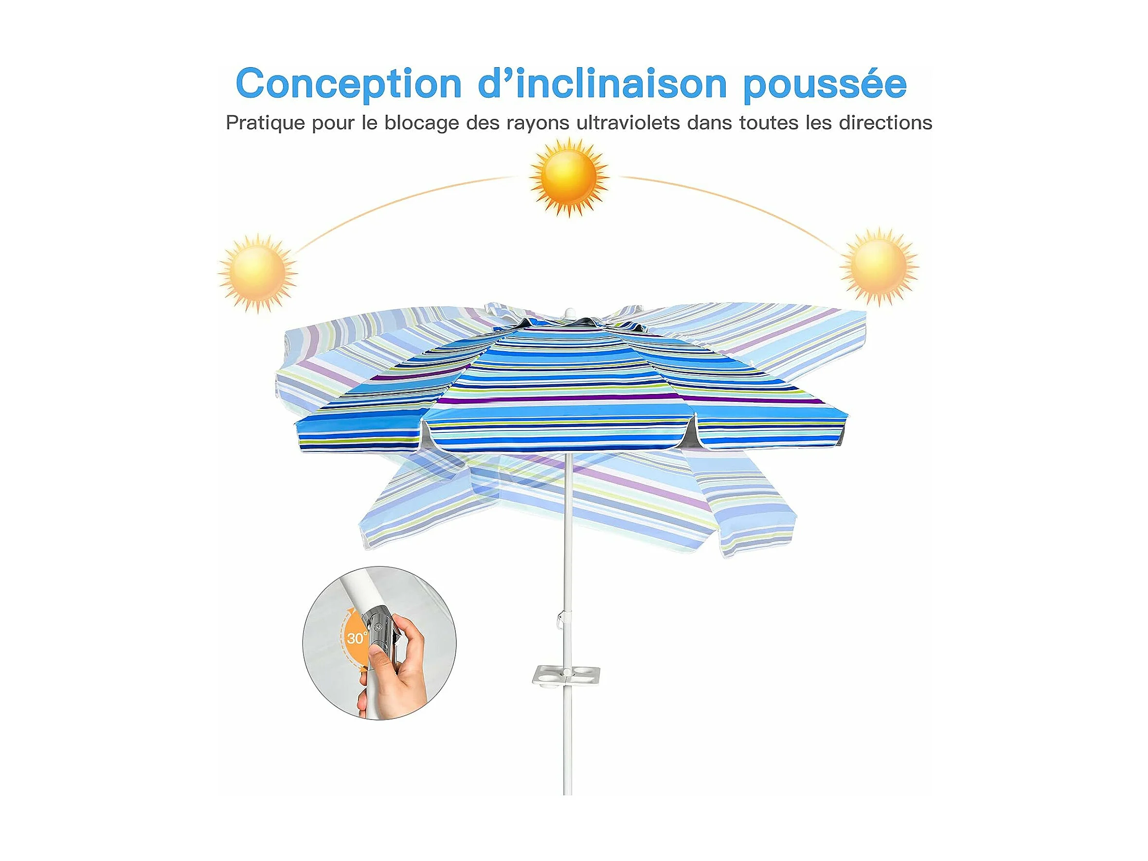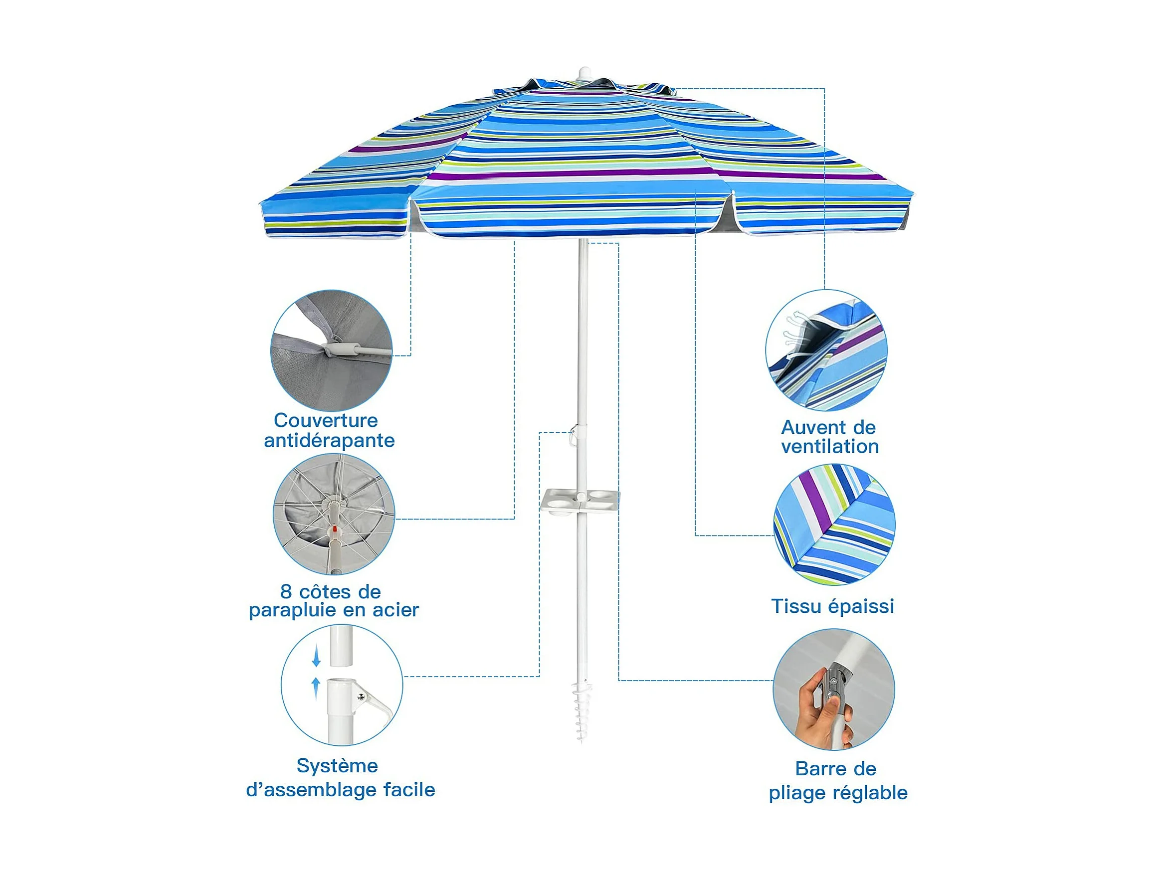 Parasol Pliable 2,2M Mécanisme Inclinable 30° avec Porte-Gobelet Fixation pour Sable Protection UPF50+ Portable Extérieur (Bleu)