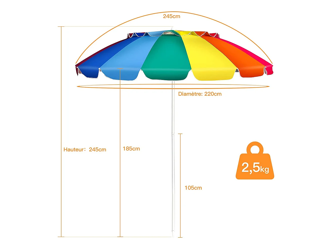 Parasol de Plage Inclinable 2,45 M Protection UPF 50+ Baleines en Fibre de Verre avec Sac Pied Amovible Arc-en-Ciel