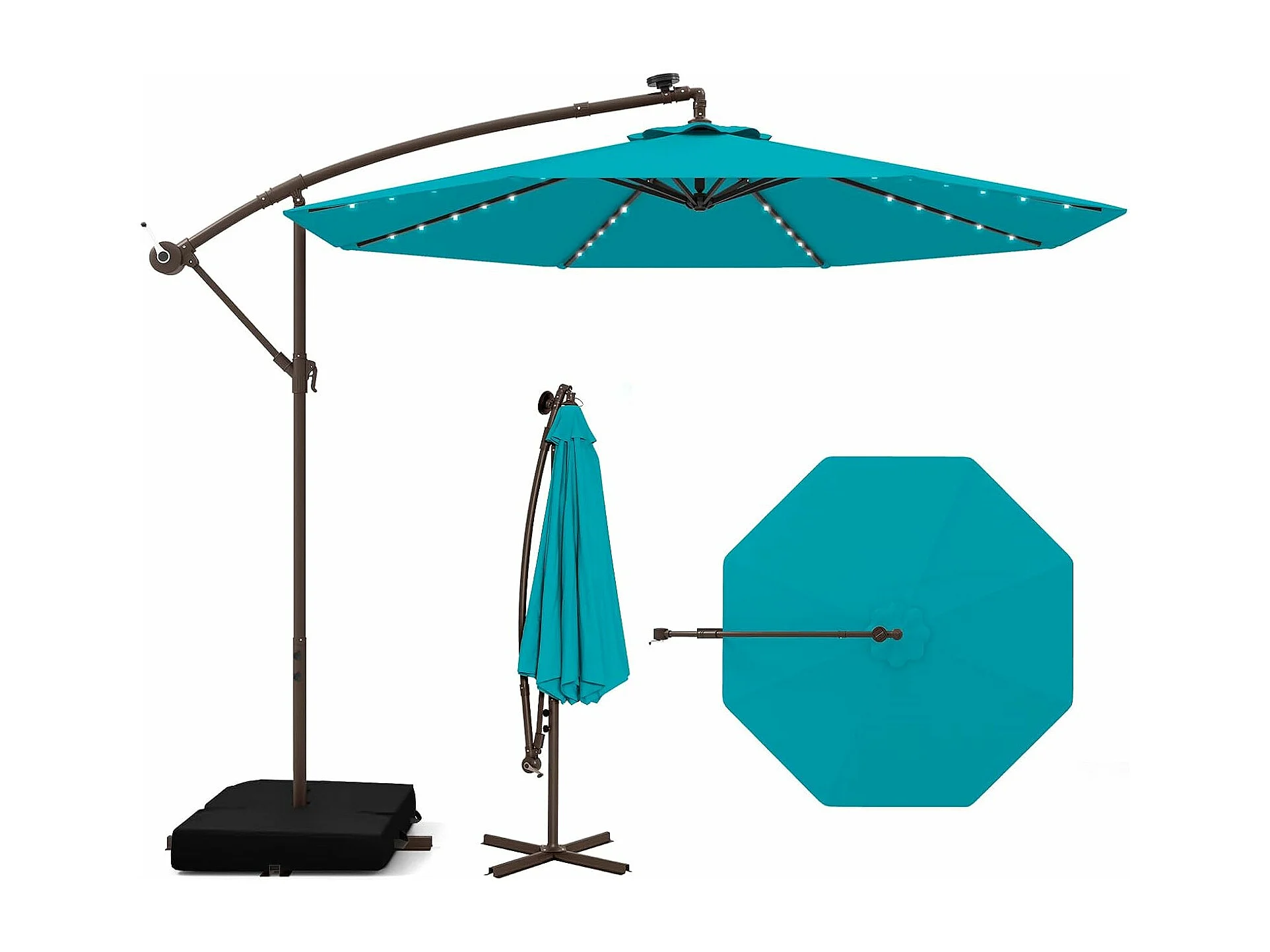 Parasol Déporté 3 x 3M, Grand Parasol de Jardin Extérieur Lumineux Solaire avec 2 Sacs de Sable, Base Croisée, Parasol Inclinable avec Manivelle (Bleu Clair)