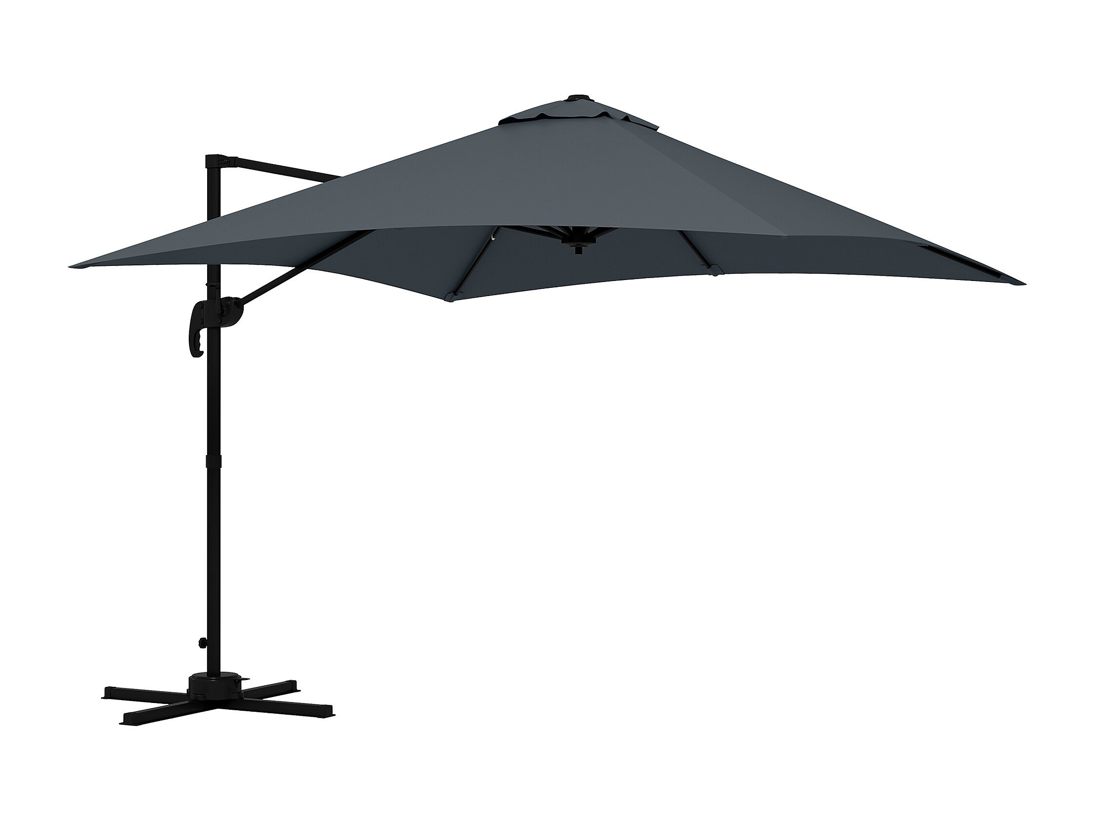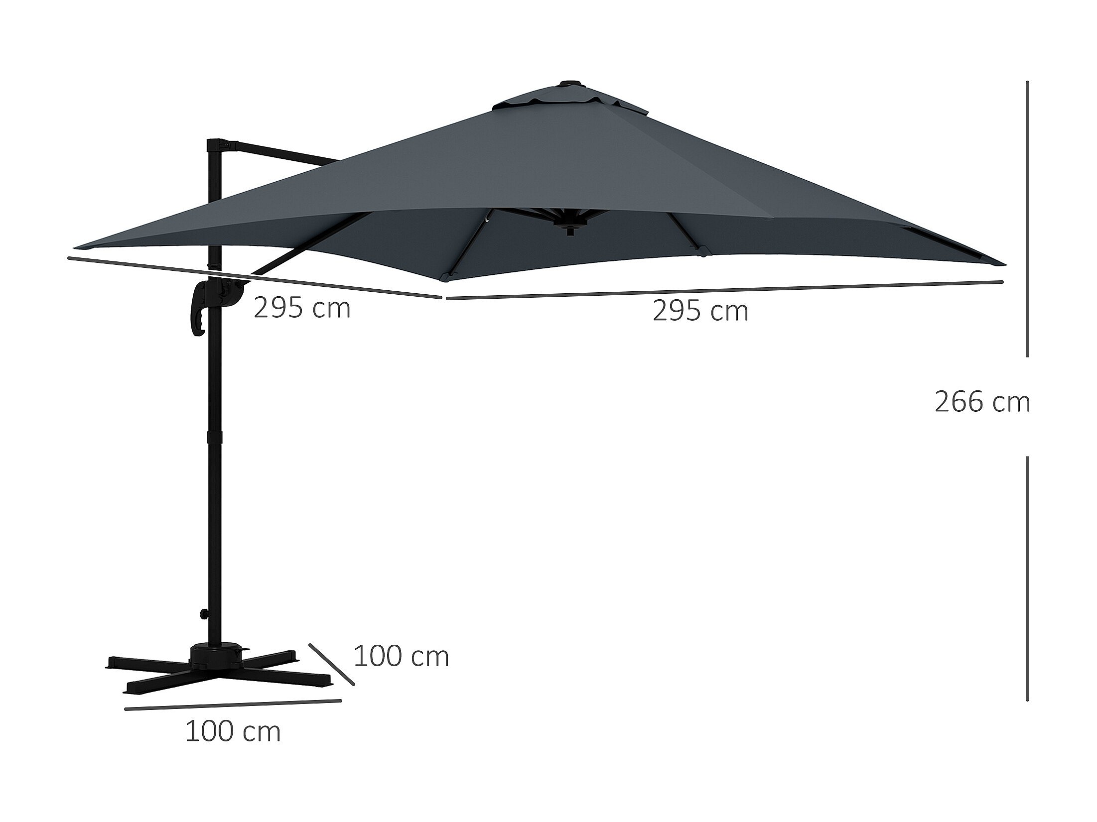 Parasol déporté carré inclinable pivotant 360° manivelle piètement acier dim. 2,95L x 2,95l x 2,66H m gris