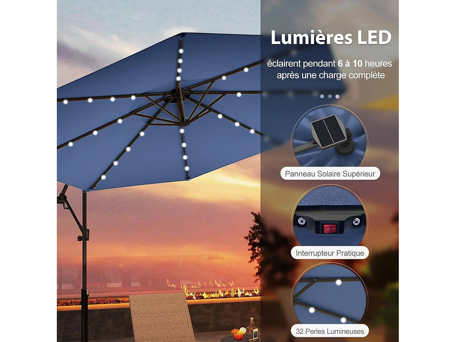 Parasol Déporté Excentré 300 CM, 32 LED Solaire, Inclinable et Rotation à 360°, 8 Baleines, Base Croisée, Parasol à Manivelle (Marine)