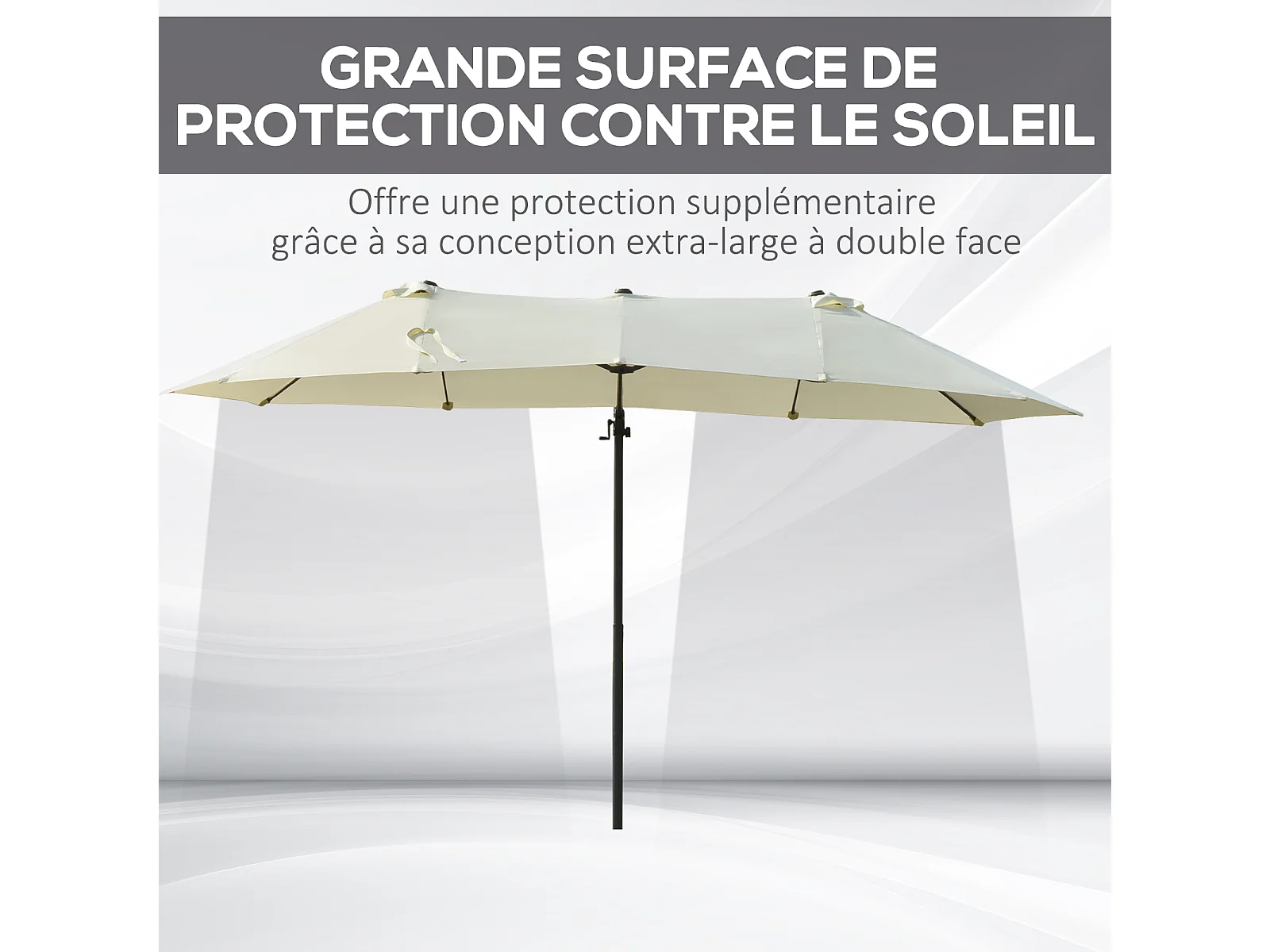 Parasol déporté grande taille XXL inclinable dim. 4,4L x 2,7l x 2,5H m piètement en acier inclus polyester crème