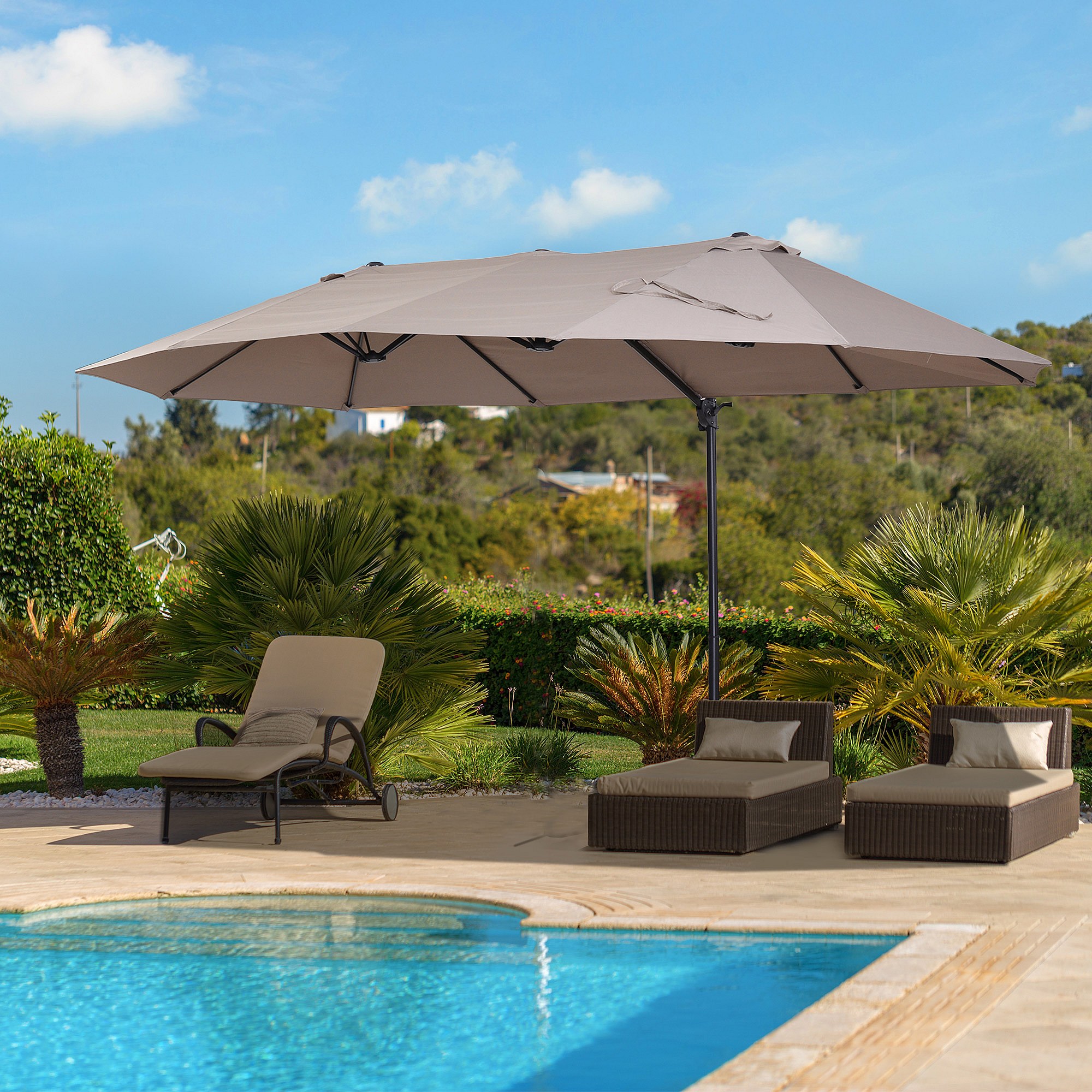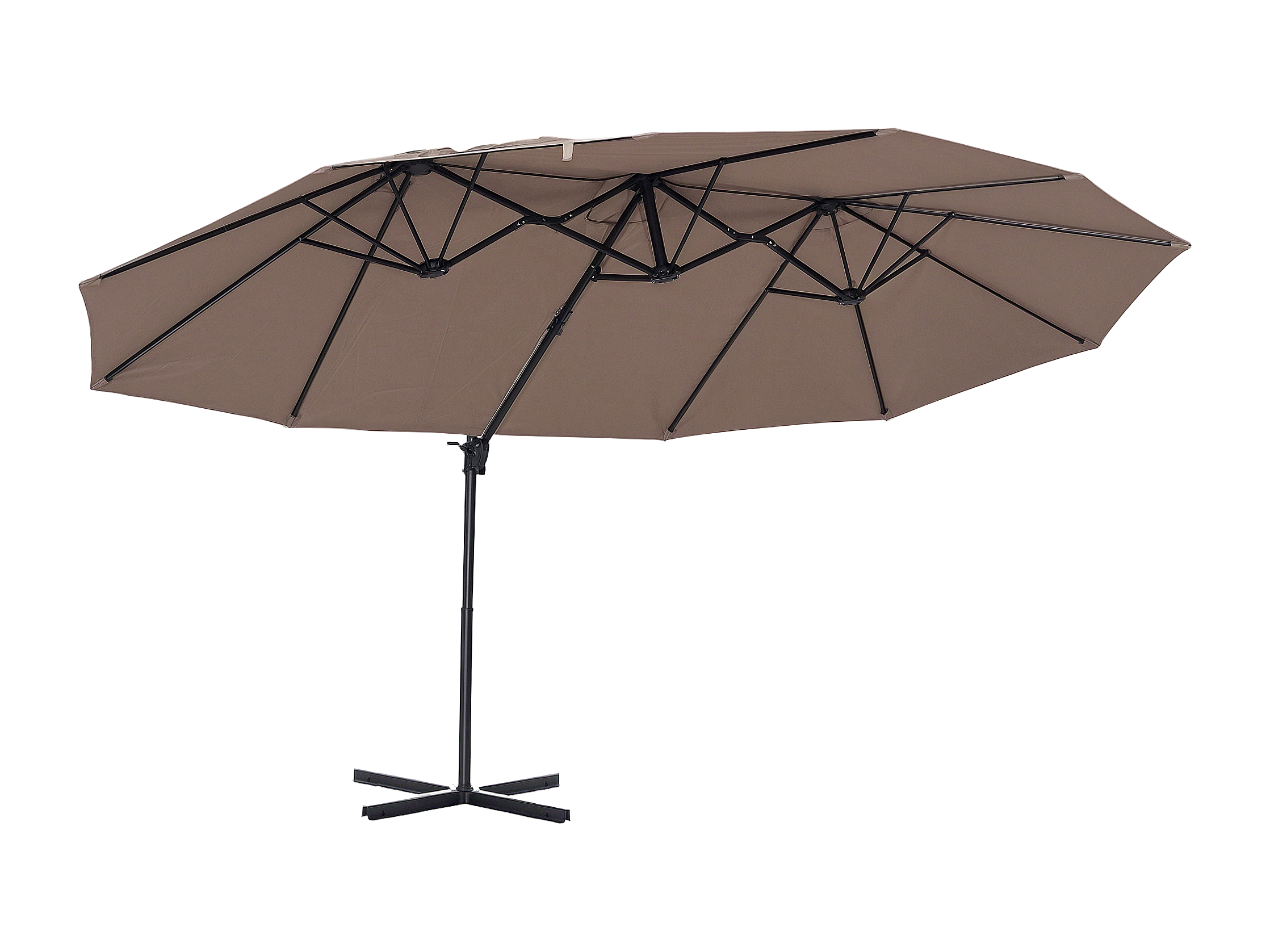 Parasol déporté grande taille XXL inclinable dim. 4,4L x 2,7l x 2,5H m piètement en acier inclus polyester marron