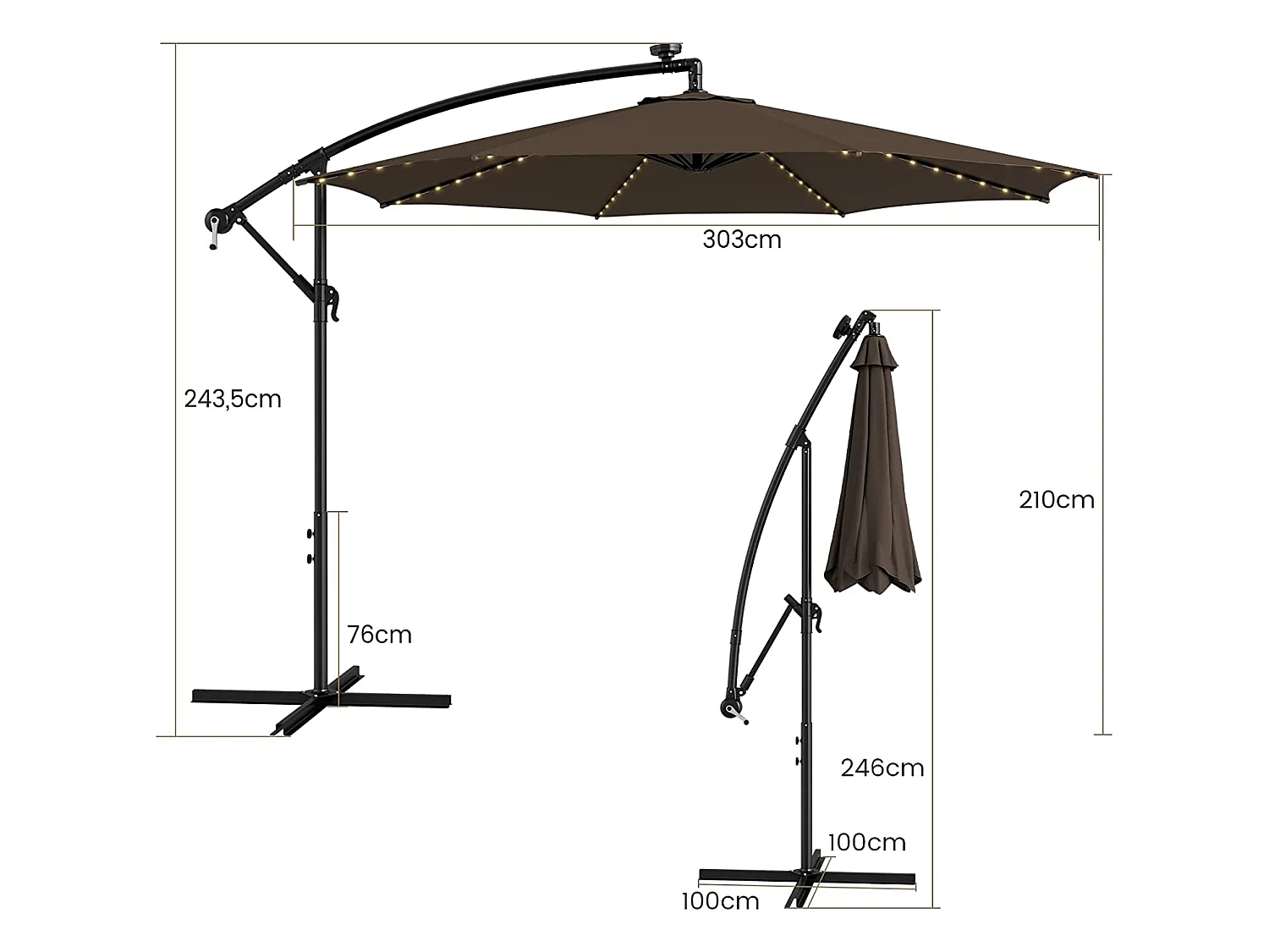 Parasol Déporté Inclinable 3M,112 Lumières LED, Panneau Solaire,Base Croisée Manivelle,Verrou de Sécurité, 303x243,5cm Café