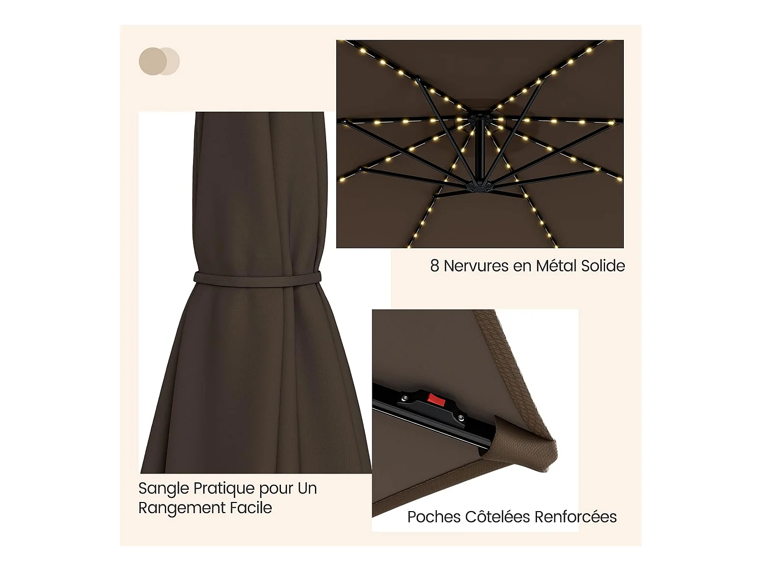 Parasol de Jardin/Parasol Déporté et Inclinable de Jardin Dia 270 CM avec 16 LED Marron