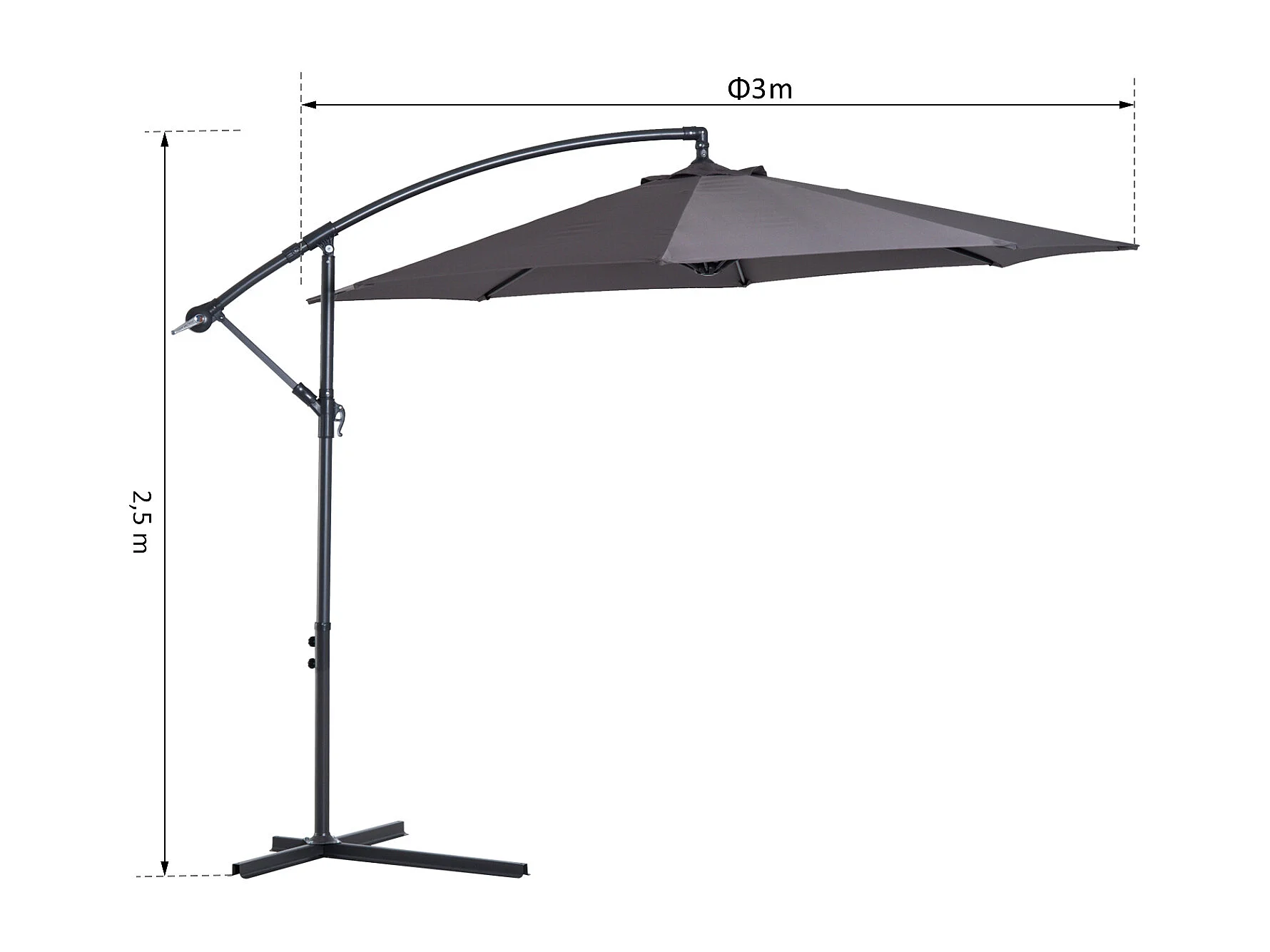 Parasol déporté octogonal inclinable manivelle pied acier Ø 3 x 2,5H m gris