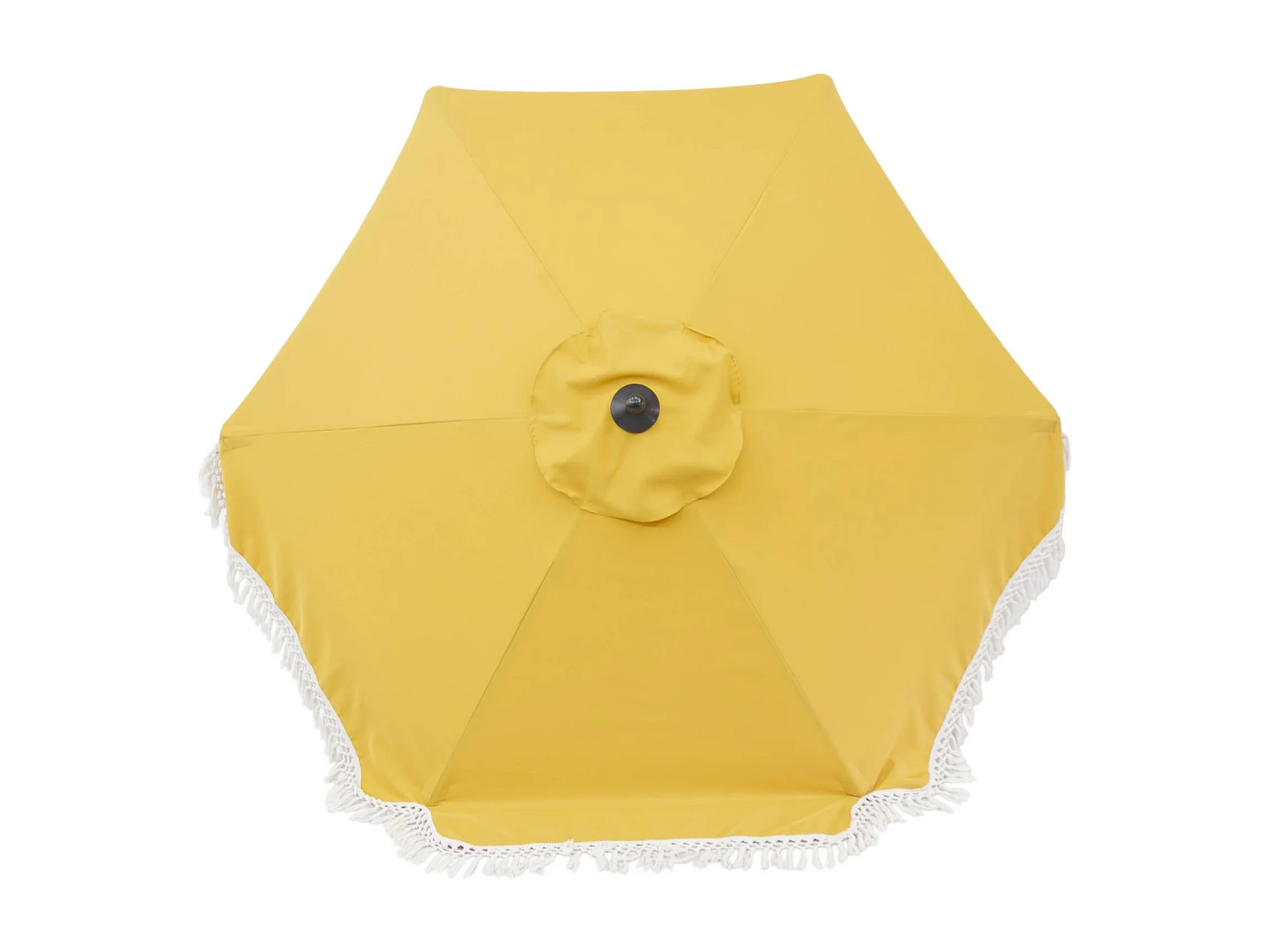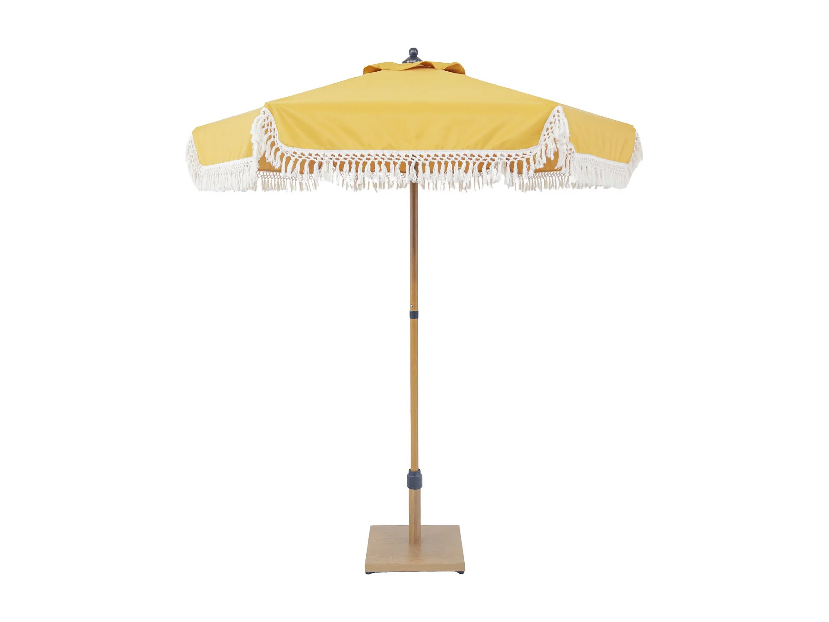 Parasol HOSSEGOR droit à franges 2m. ocre. acier. mât effet bois. UPF 30+. D 200 x H 225 cm
