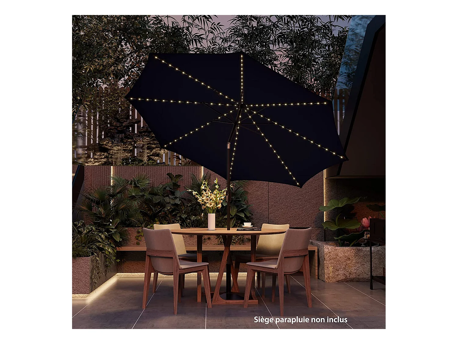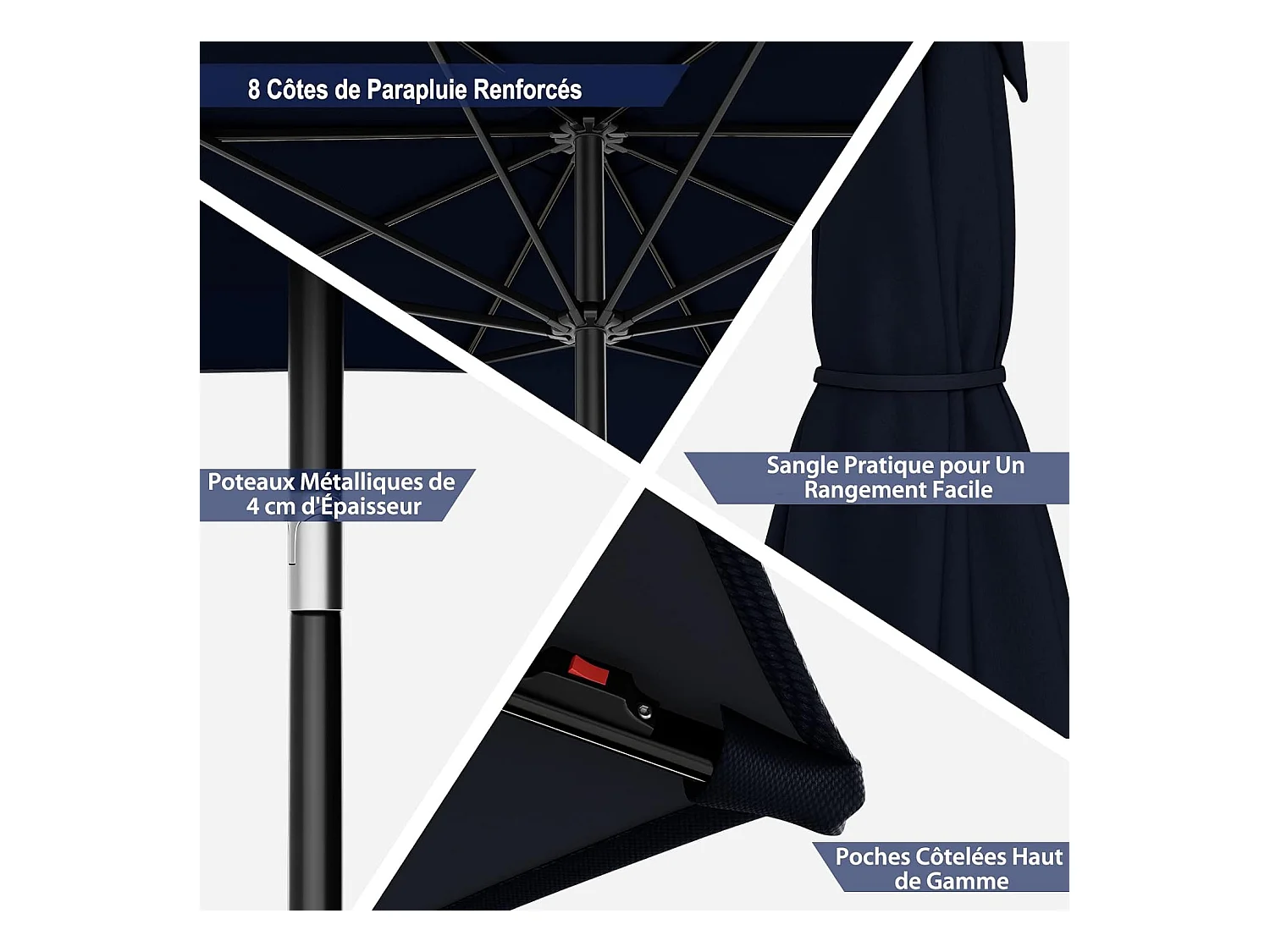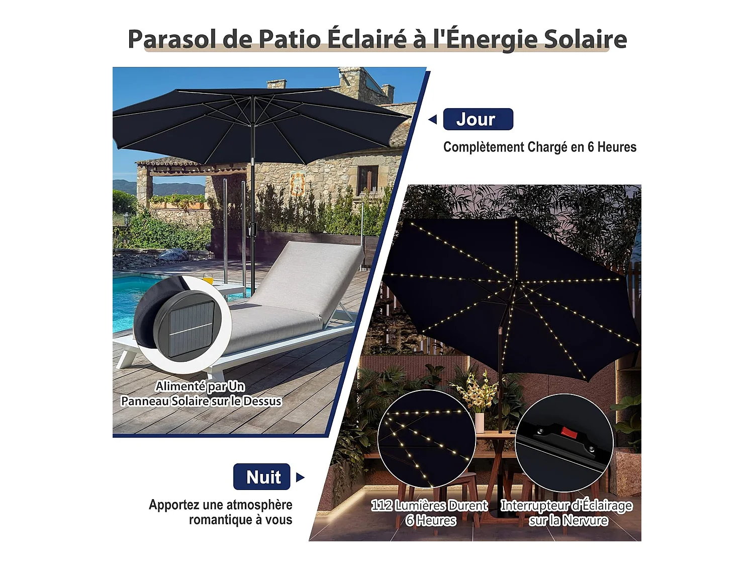 Parasol Inclinable 3M, 112 Lumières LED, Panneau Solaire, Manivelle à Bouton-poussoir,Toile Ventilée Marine