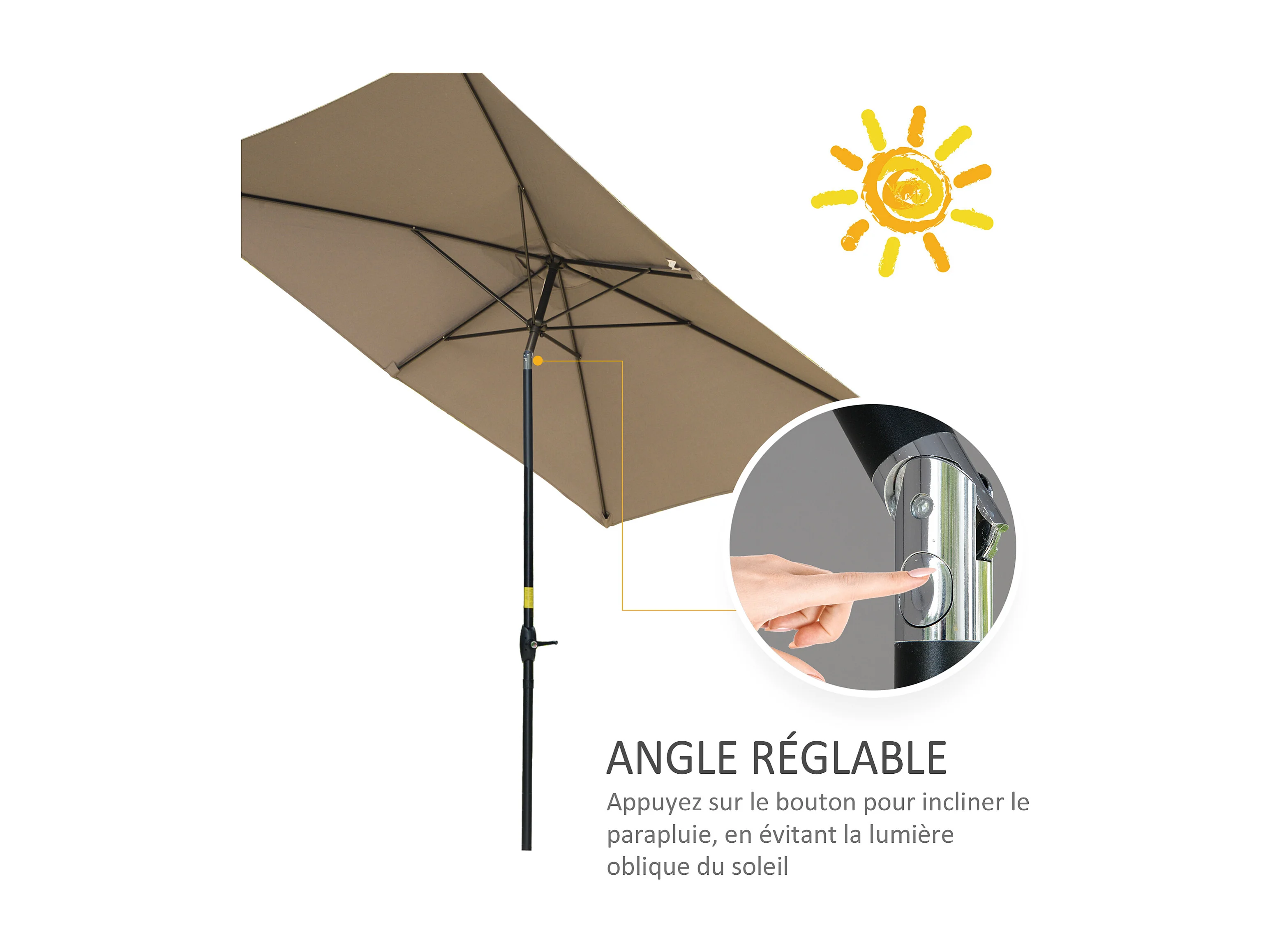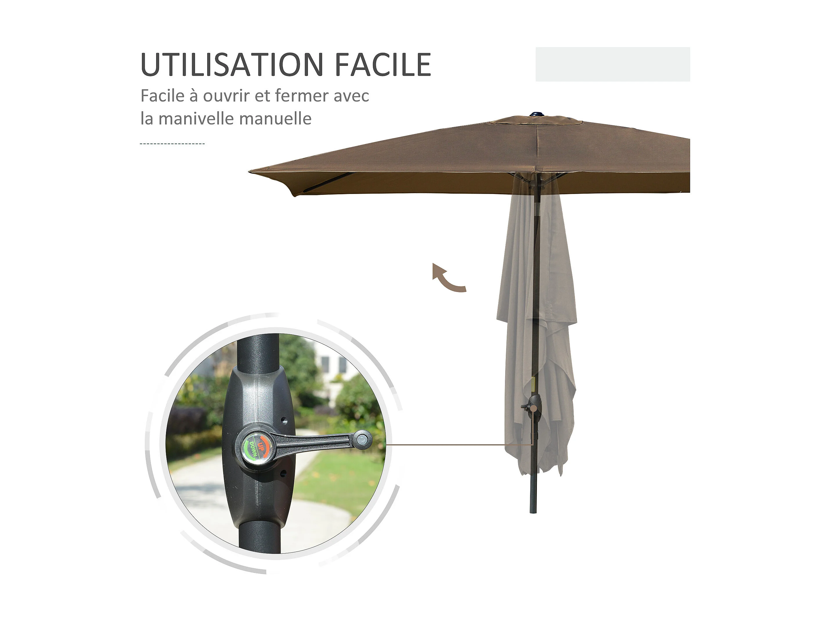 Parasol rectangulaire inclinable de jardin avec manivelle métal polyester haute densité anti UV 50+ chocolat
