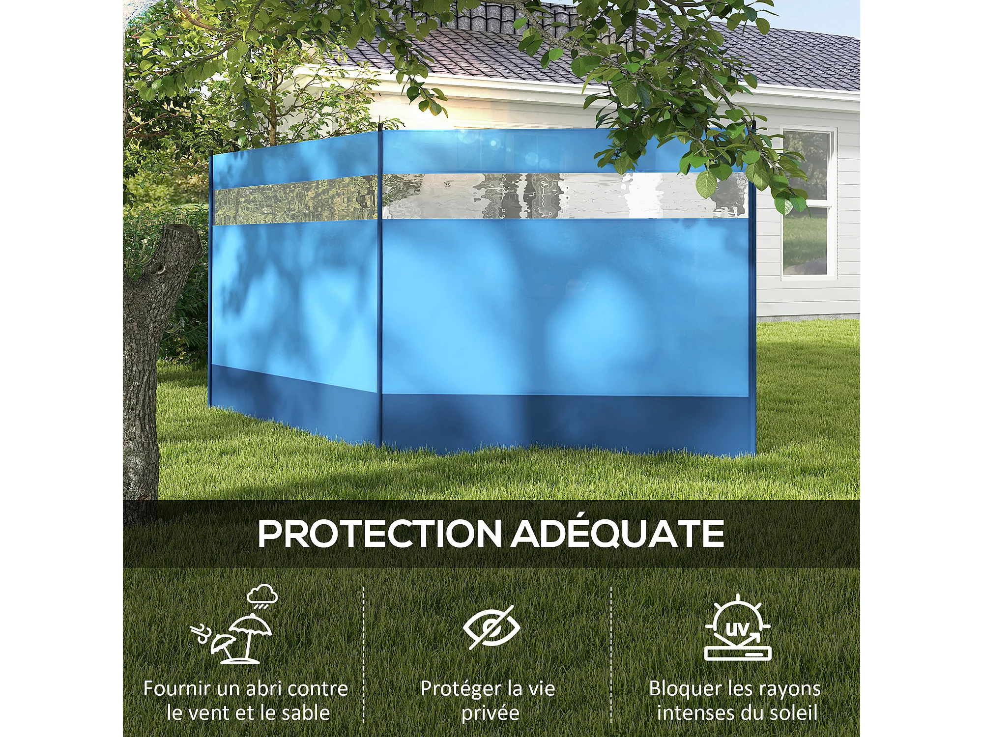 Paravent brise-vue camping plage portable pliable avec sac de transport et poteaux acier dim. 440L x 140H cm bleu
