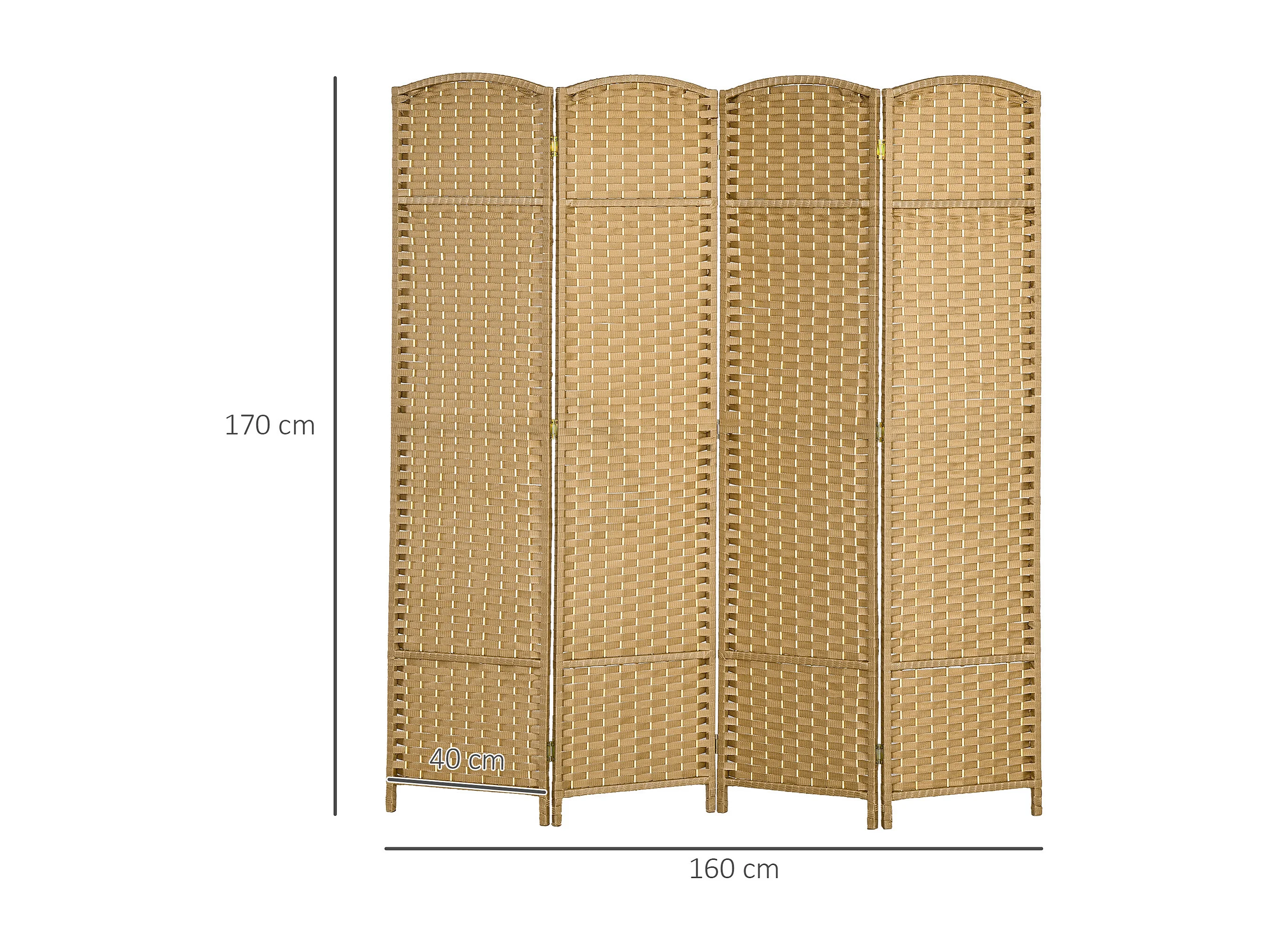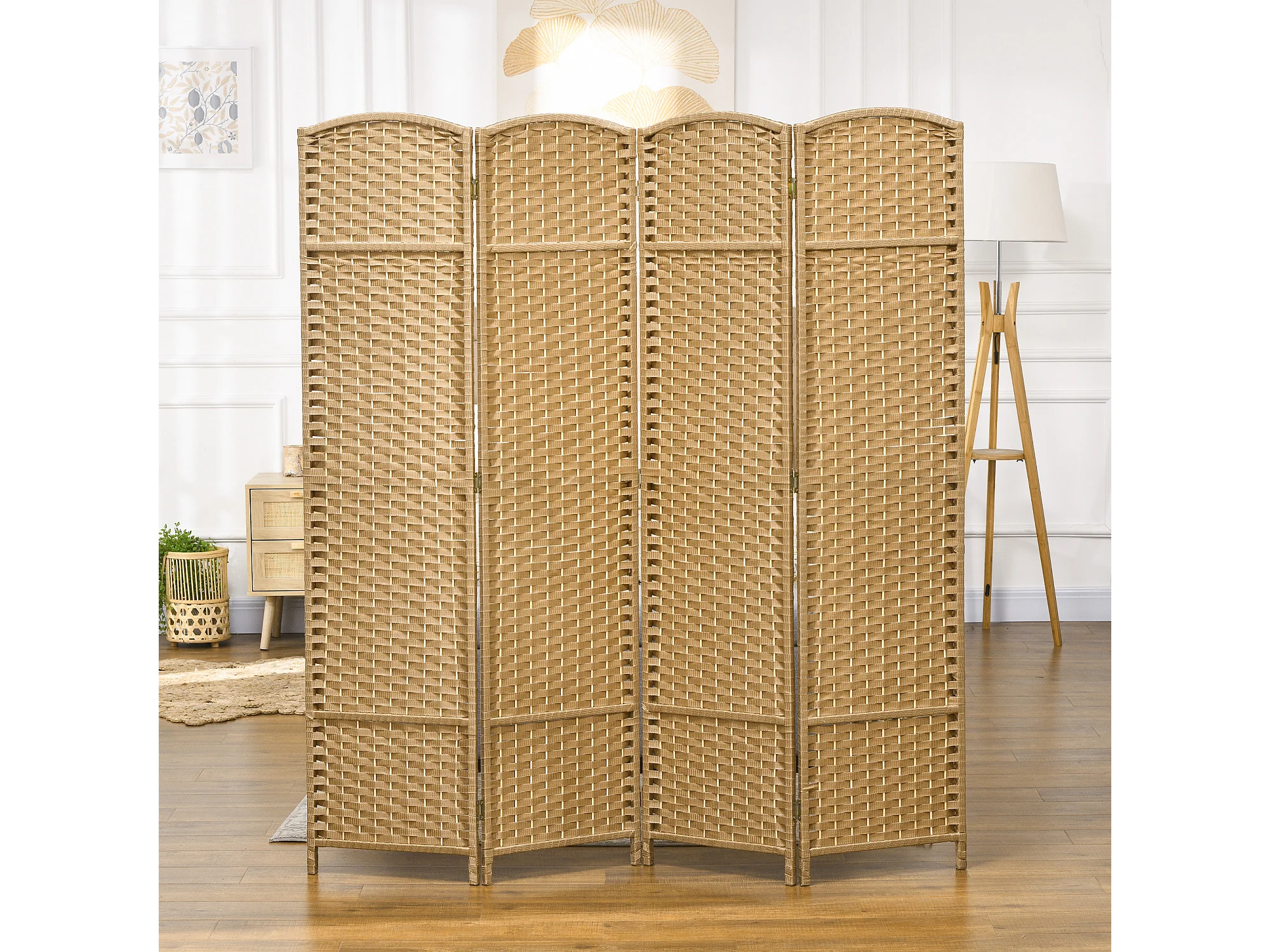 Paravent intérieur pliable 4 panneaux 160 x 170 cm - séparateur de pièce finition tressée - PP bois pin beige