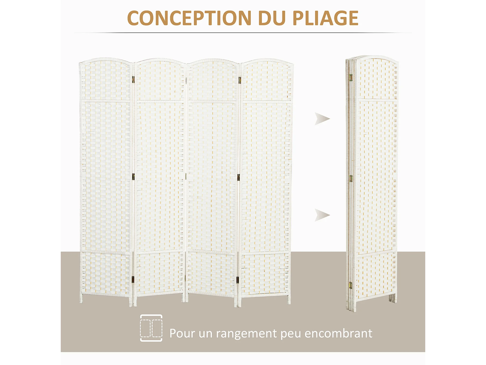Paravent interieur pliable 4 panneaux 160 x 170 cm séparateur de pièce résine tressée effet rotin bois blanc