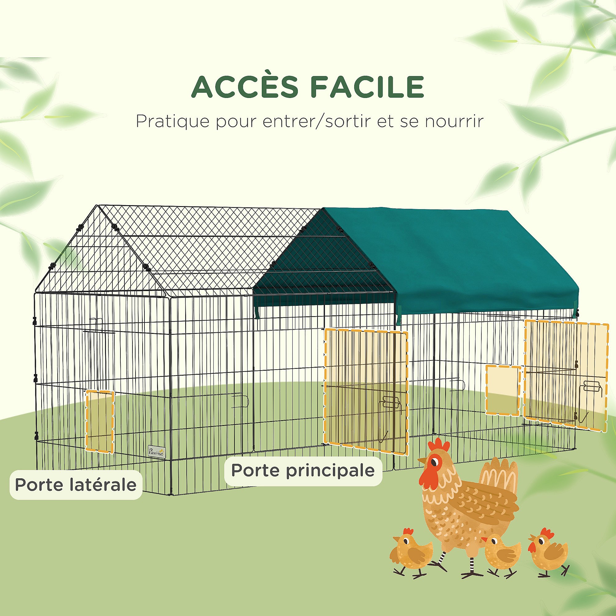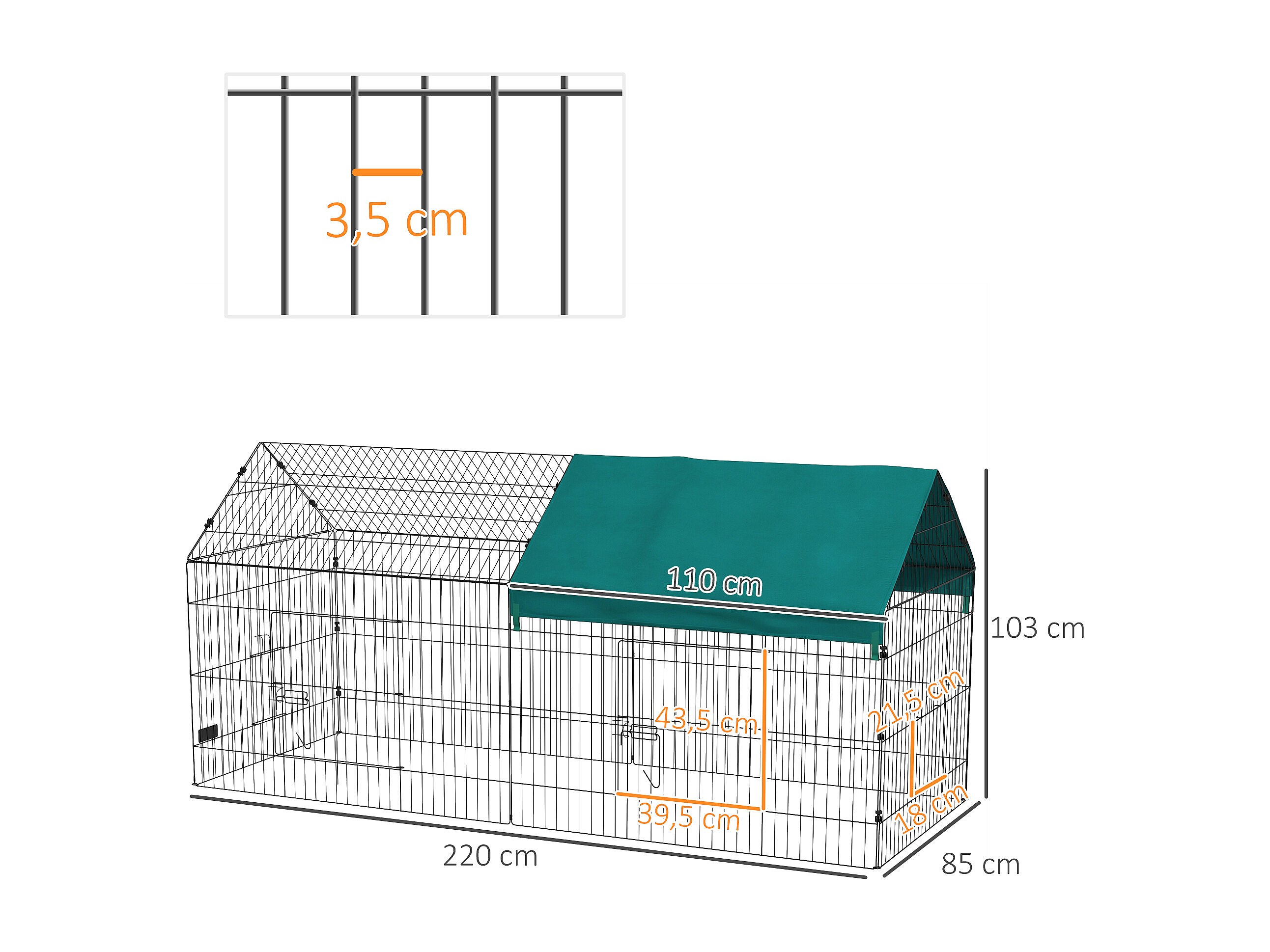 Parc enclos petits animaux - 2 portes, 3 trappes nourrissages, zone couverte - acier noir polyester vert