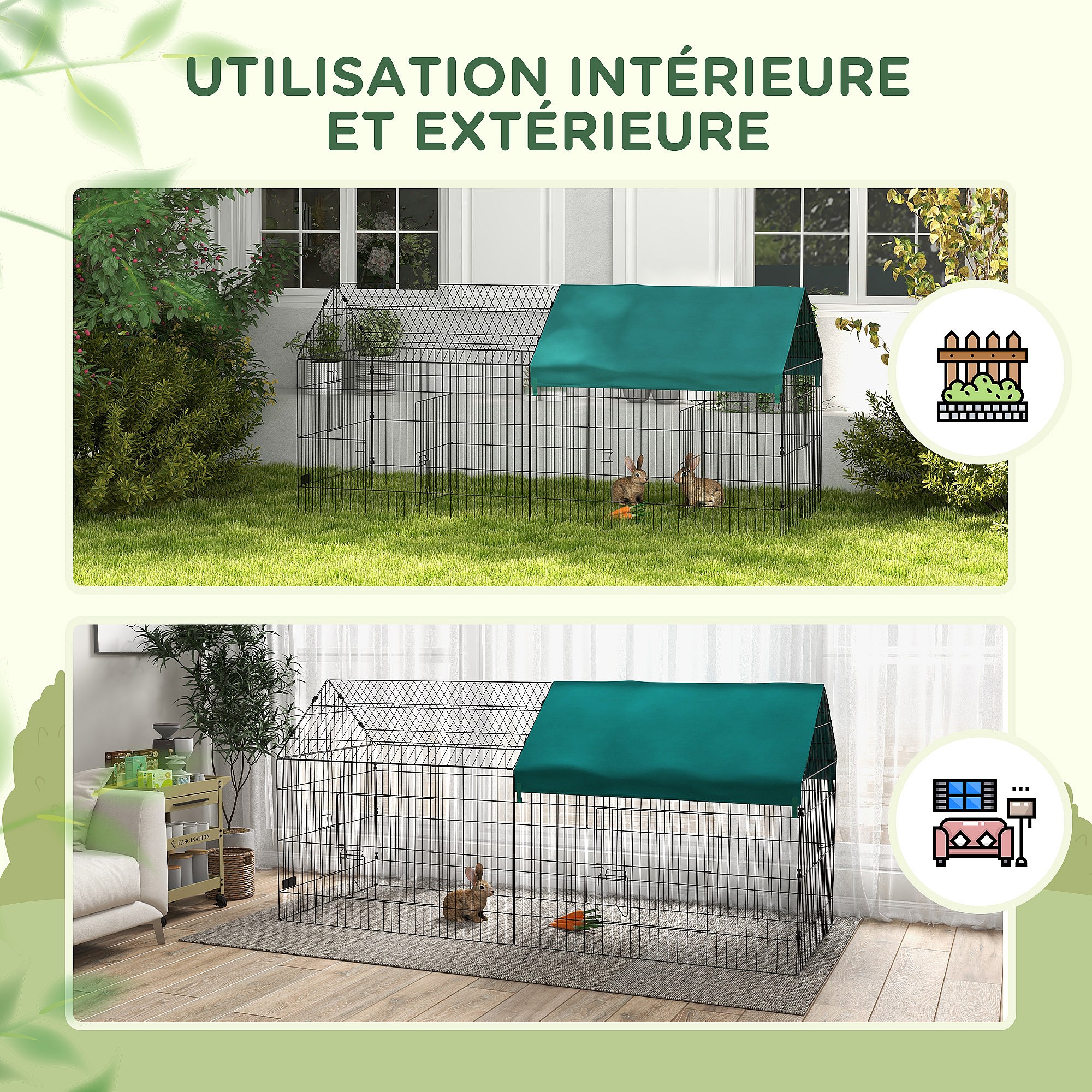 Parc enclos modulable acier avec bache pour lapins rongeurs petits animaux intérieur extérieur 185L x 75l x 50H cm vert