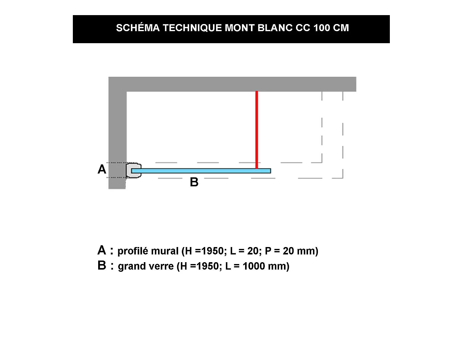 Pare douche fixe en verre sécurité transparent ép 8mm anti calcaire, L.100*H.195 cm, profilé or brossé, SUPERBAN Mont Blanc CC