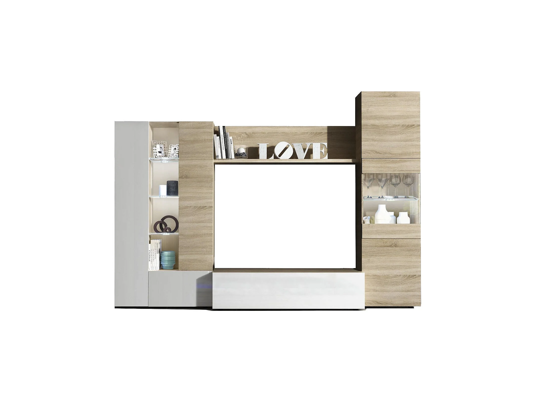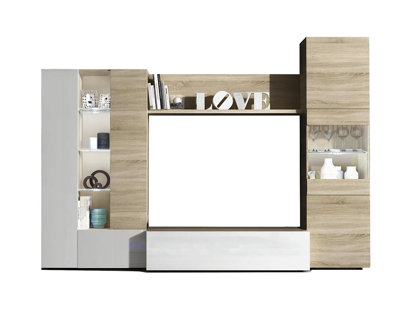 Système mural Dmaj, Meuble TV modulaire pour salon, Composition de salon avec éléments muraux et vitrines et lumière LED, 260x42h185 cm, Chêne et Blanc