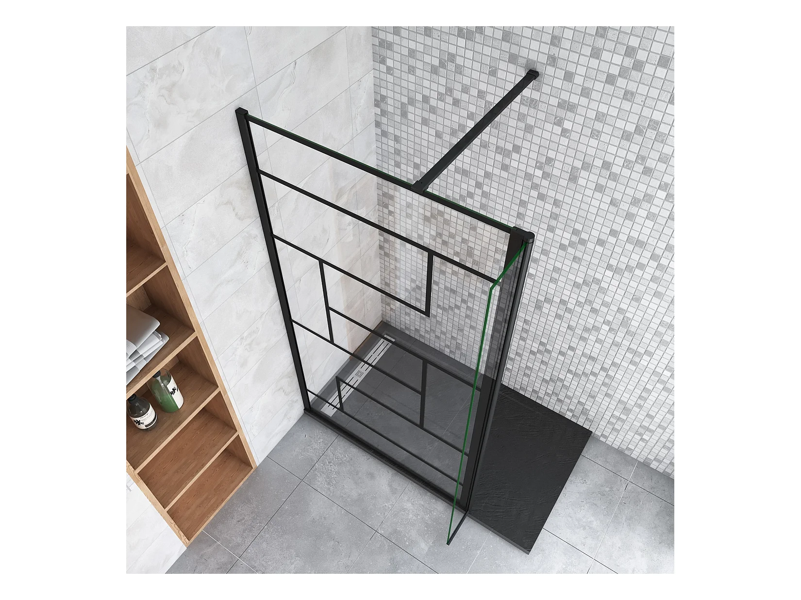 Paroi de douche fixe à l'italienne 140+40x200cm avec retour pivotant - Noir - avec barre de fixation 140cm recoupable