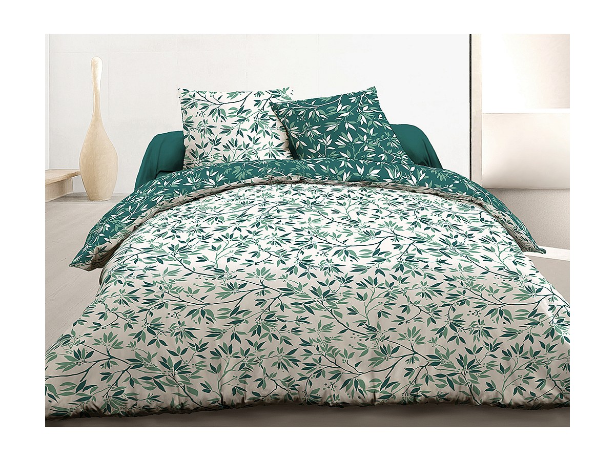 Parure de lit 100% coton BIRDY - housse de couette 240 x 260 cm + 2 taies d'oreiller 63 x 63 cm - blanc et vert