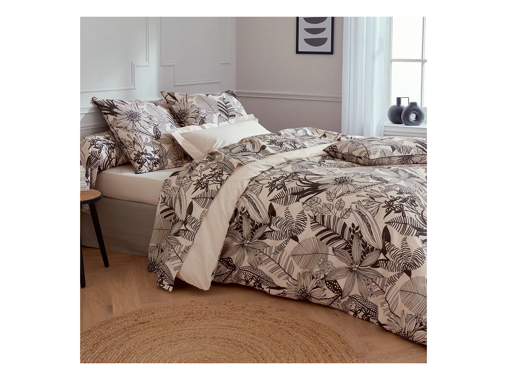 Parure de lit 240x220 cm taies 65x65 cm percale de coton ALBA beige/noir 3 pièces