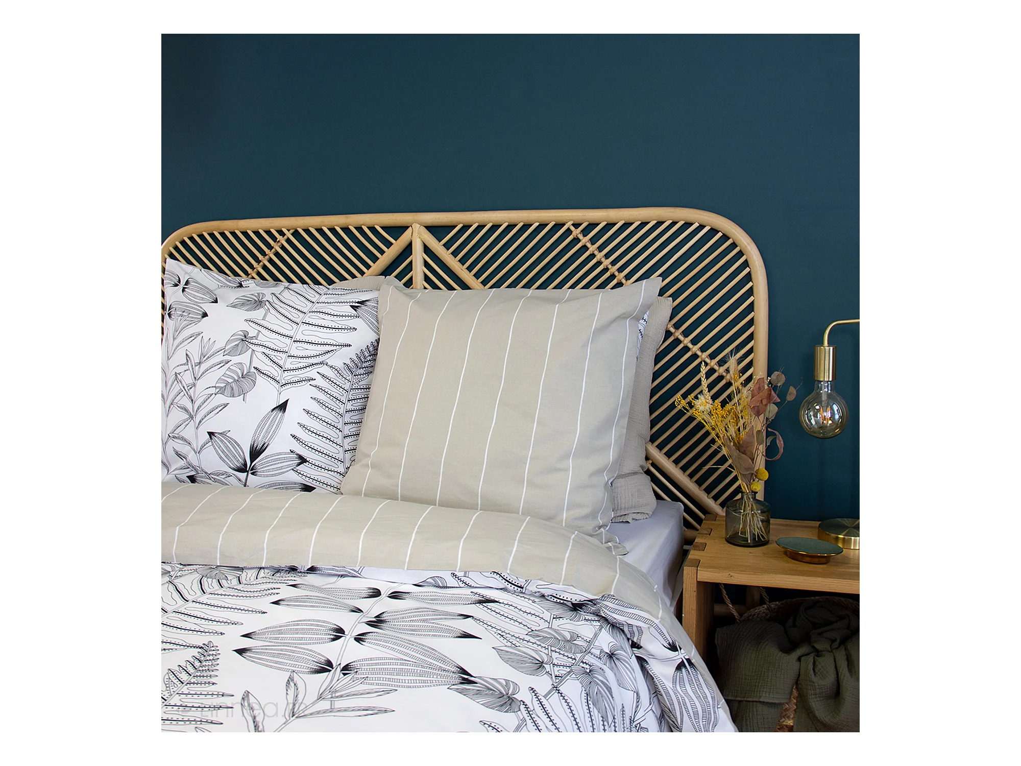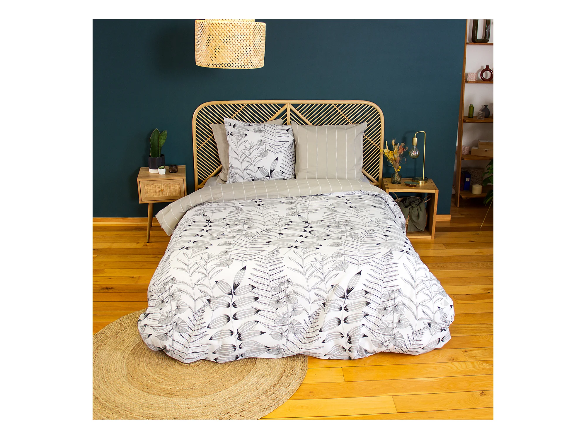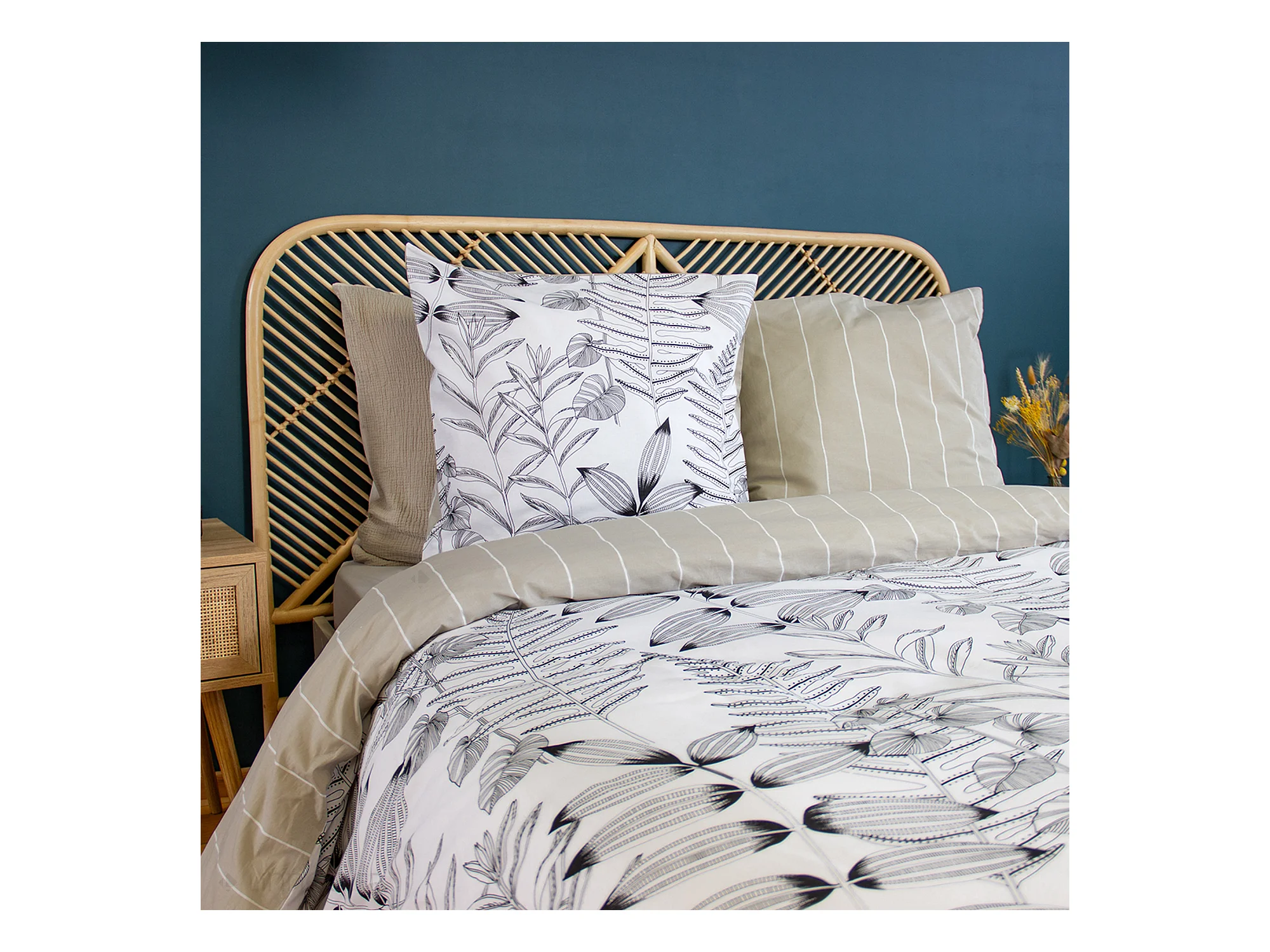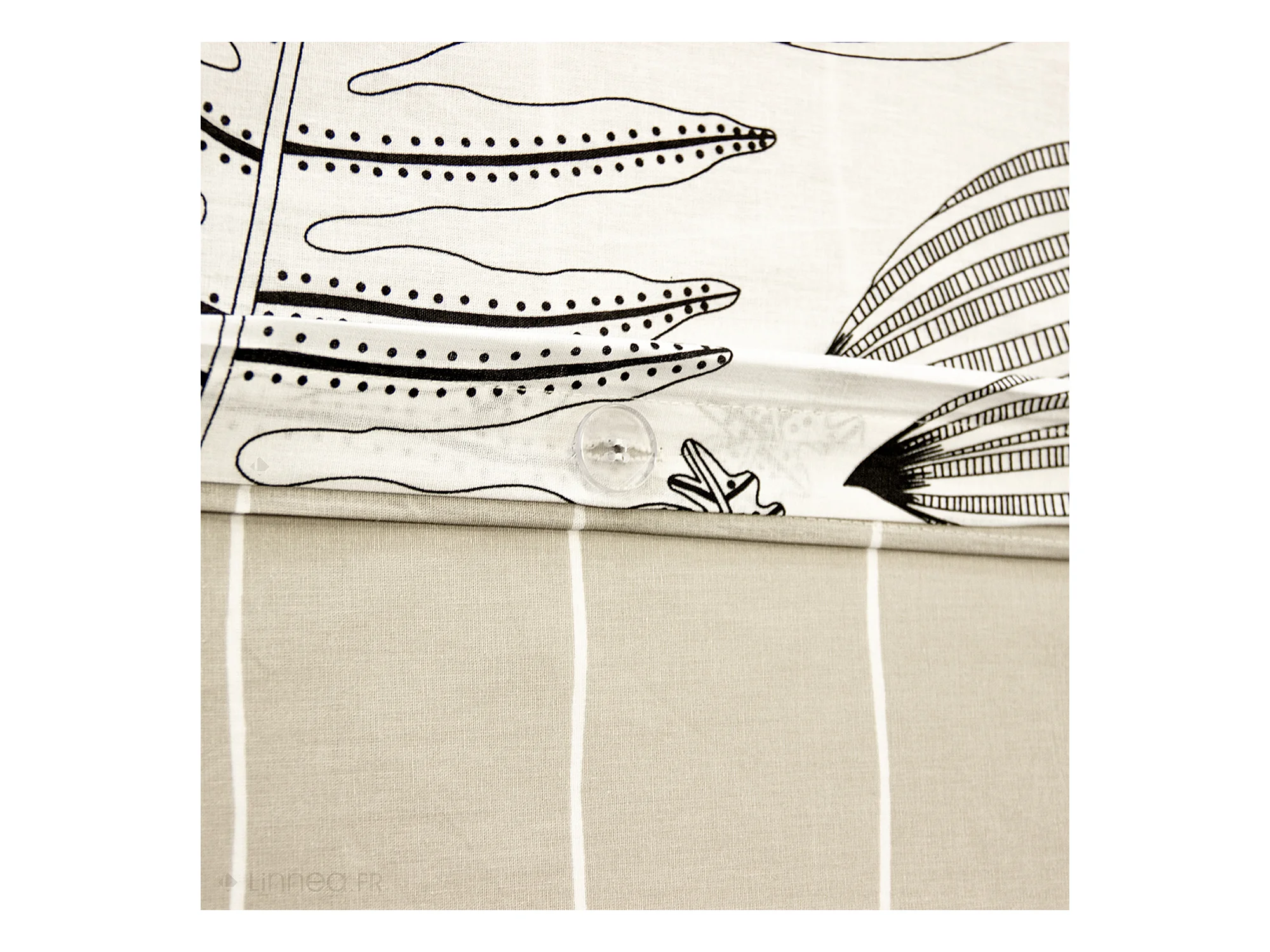 Parure de lit 240x220 cm pur coton ALIX motif végétation blanc et noir 3 pièces