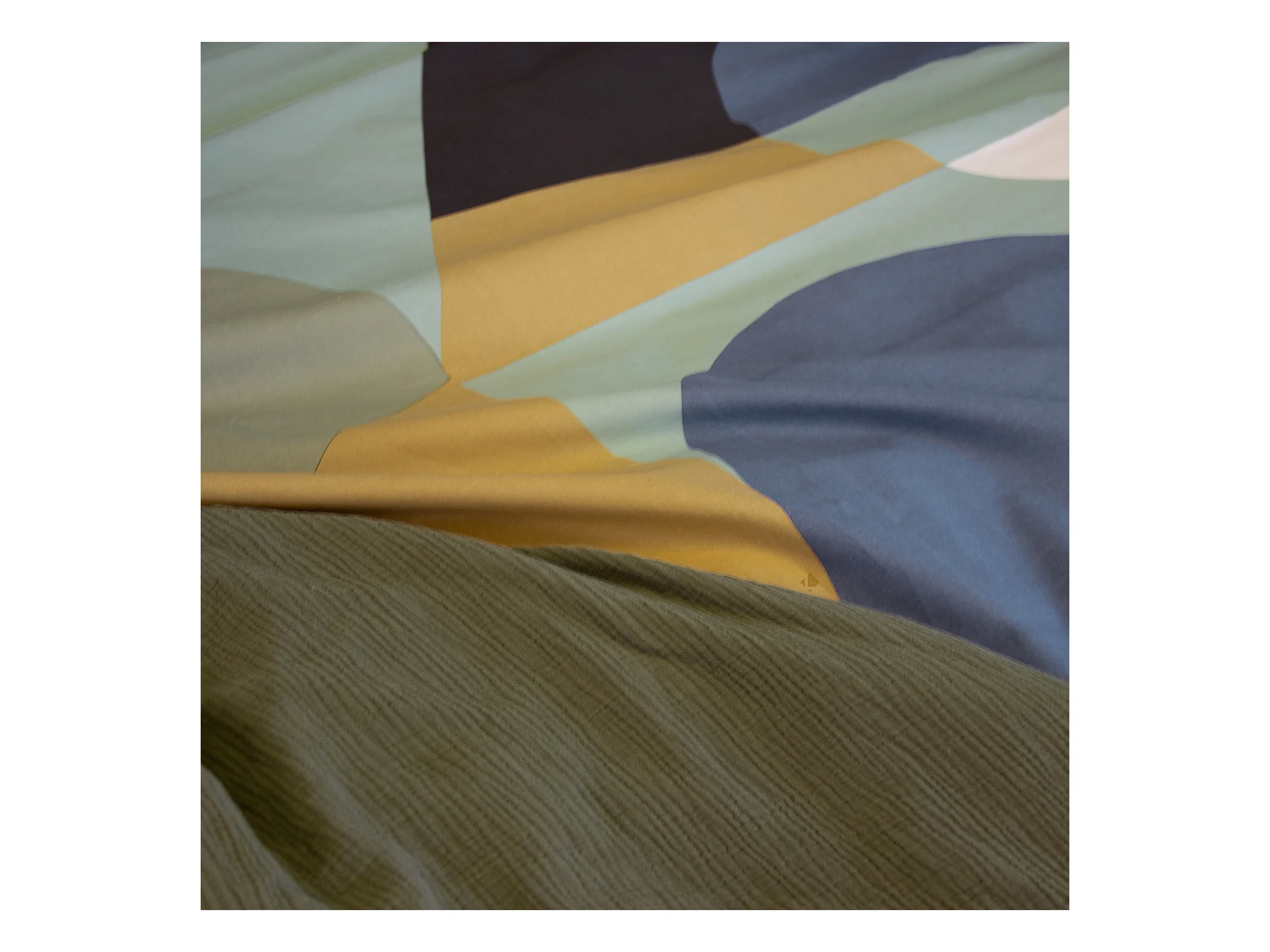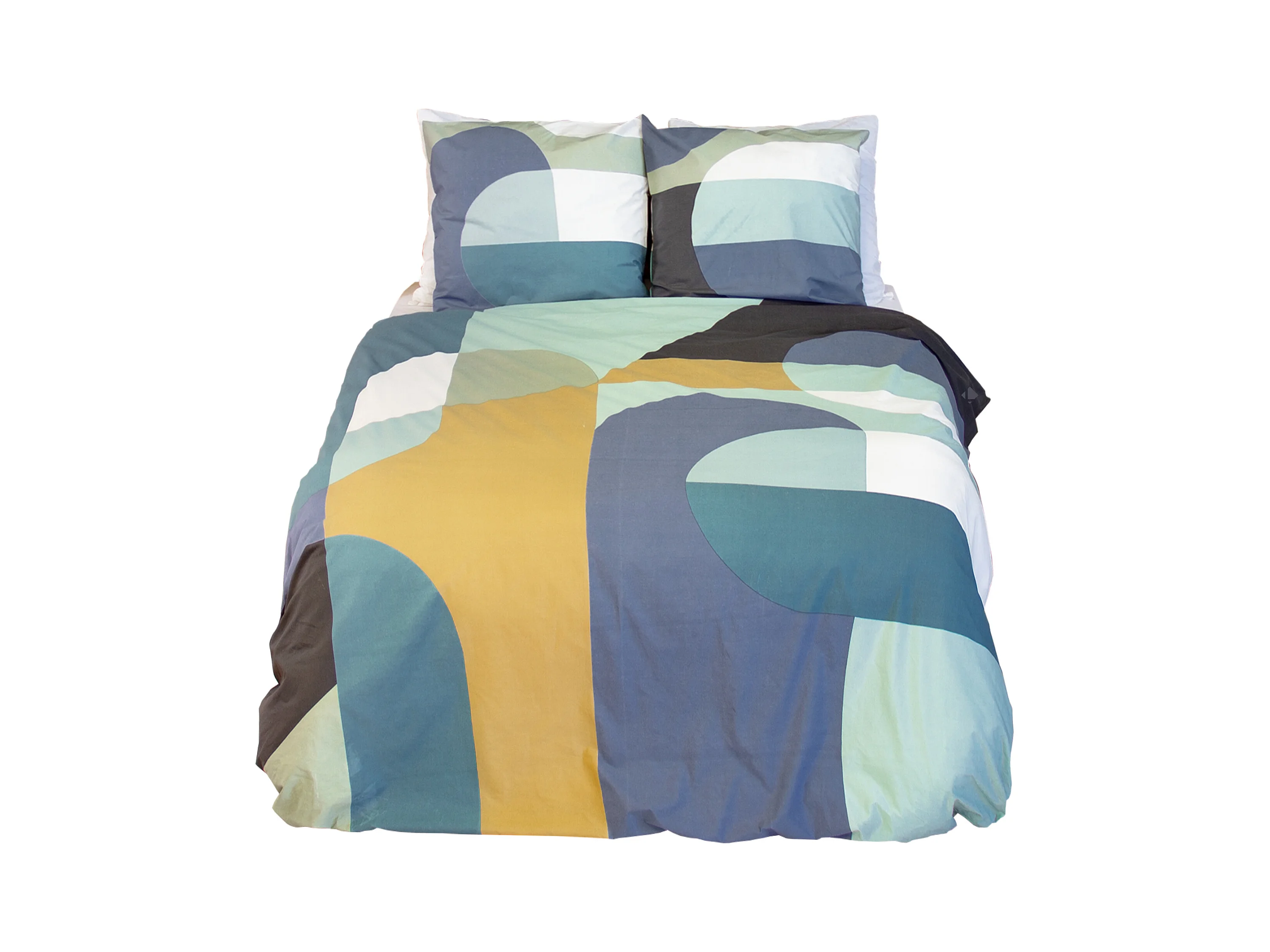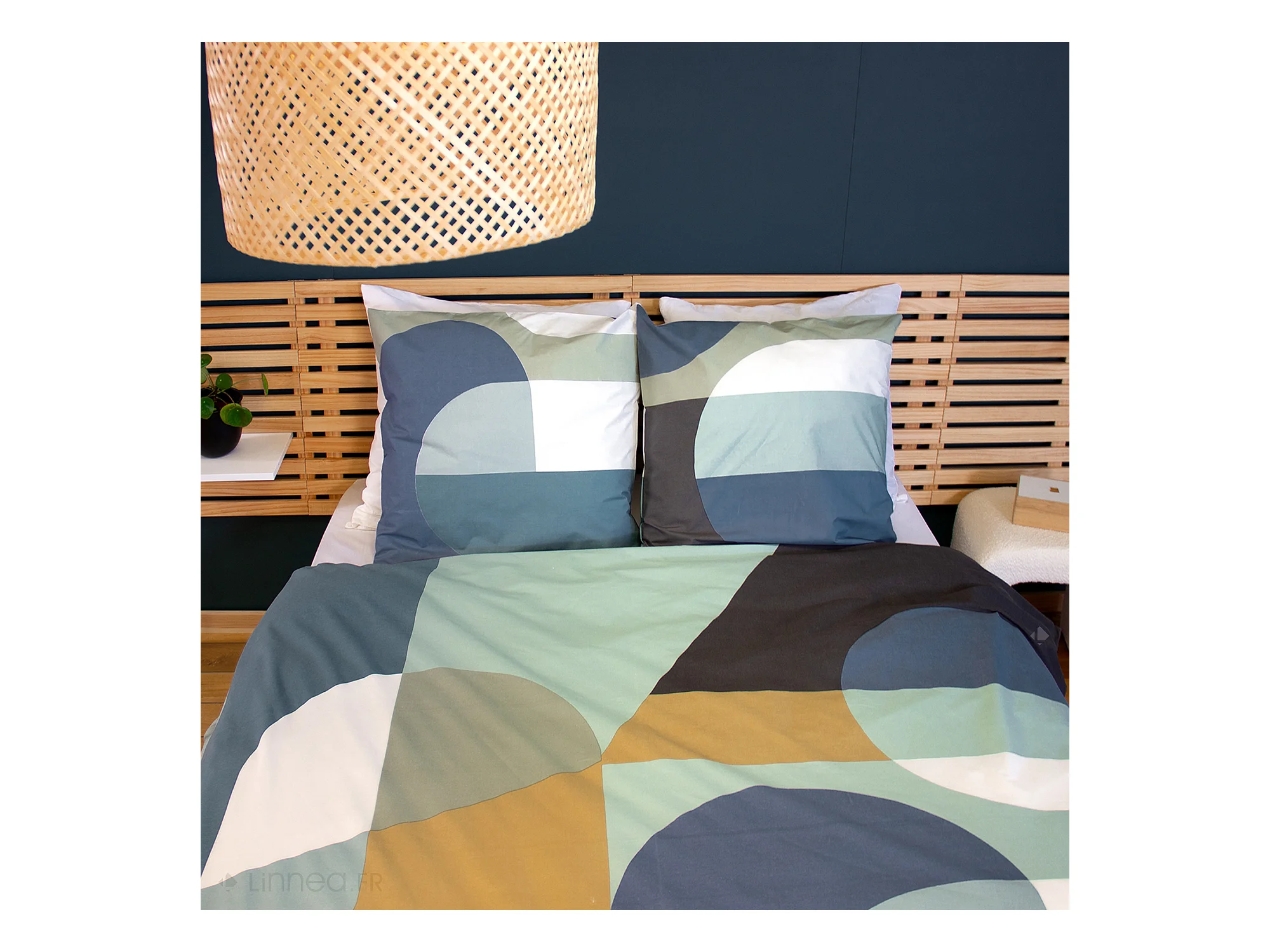 Parure de lit 260x240 cm en coton JOELE motif géométrique vert et bleu 3 pièces