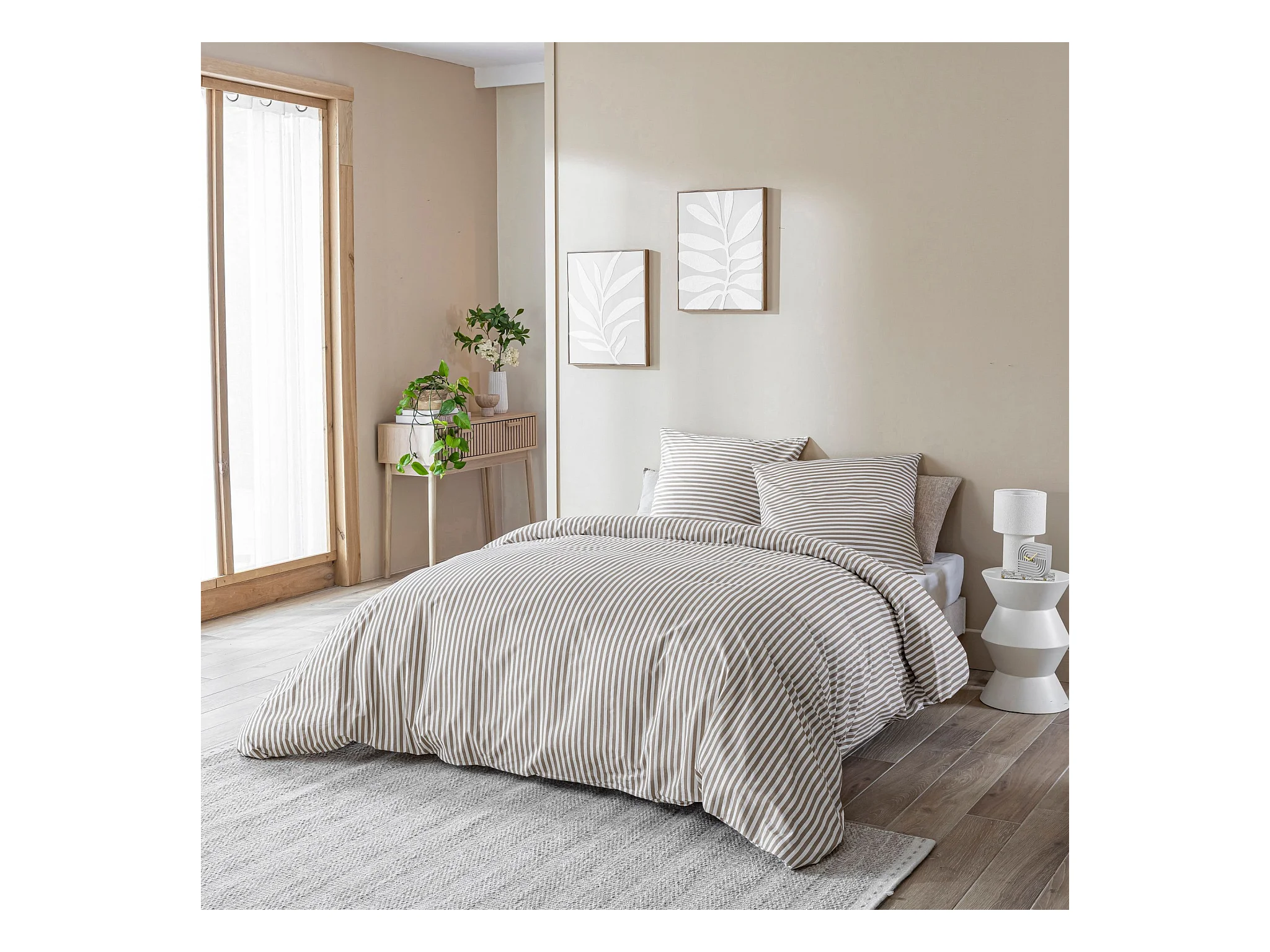 Parure de lit 200x200 coton à rayures taupe Terre de Nuit Horizon