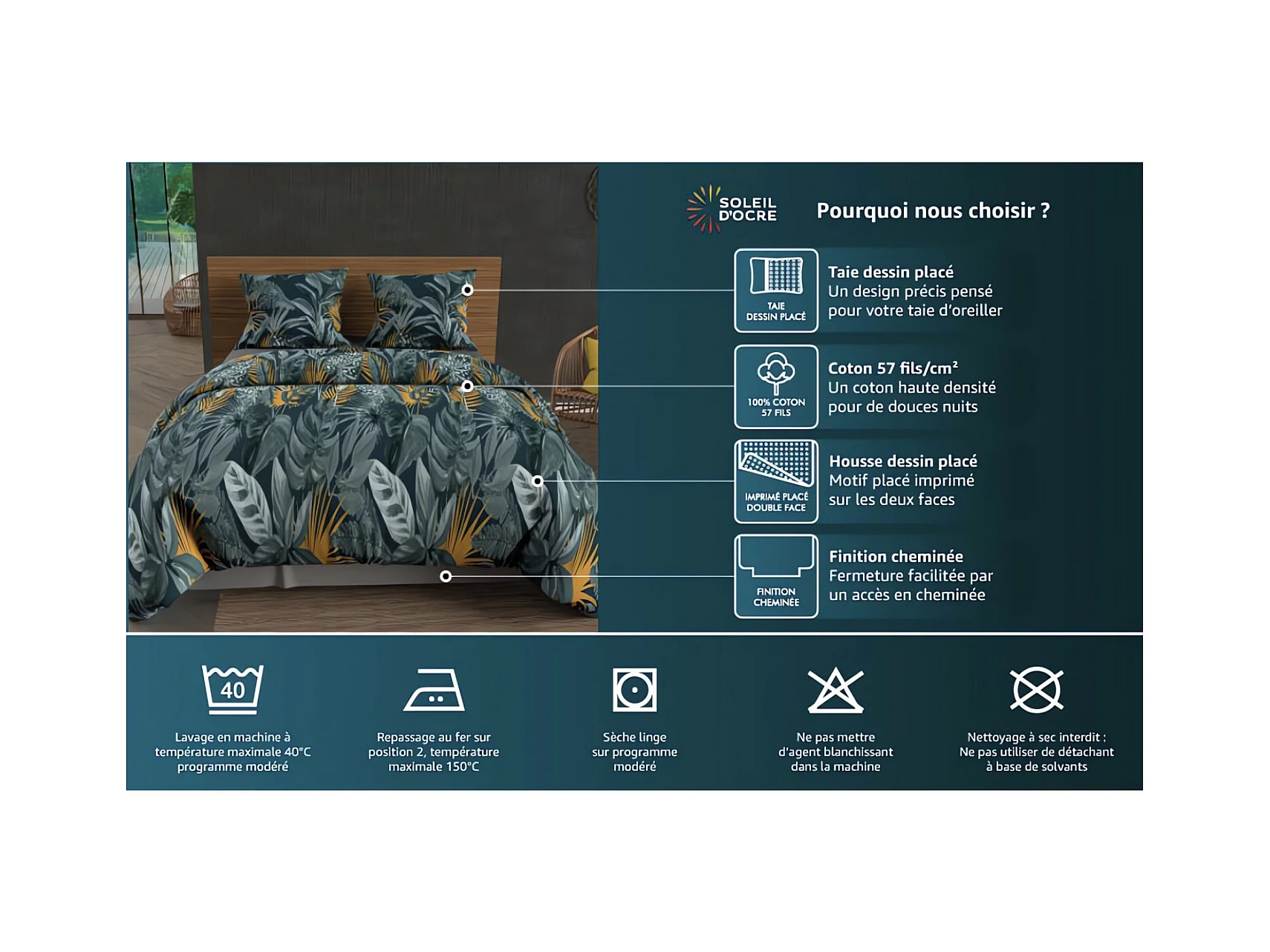 Parure housse de couette en coton 57 fils 260x240 cm TROPIC vert, par Soleil d'ocre