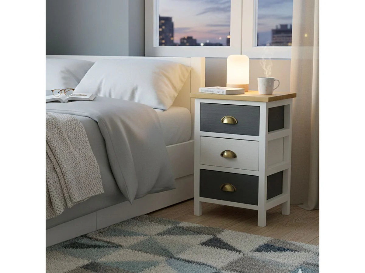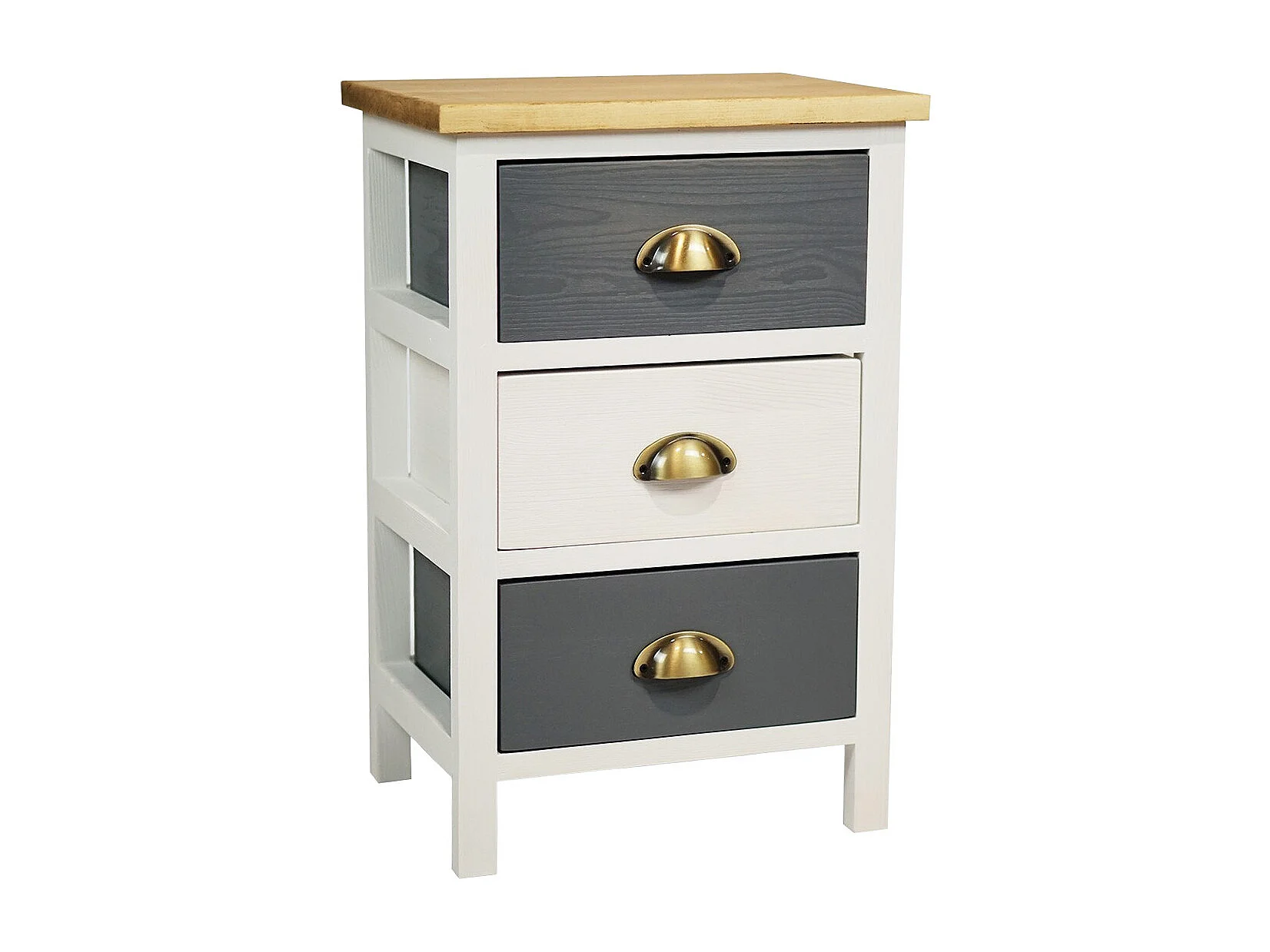 PATTY - Meuble de Rangement 3 Tiroirs en Pin Teinté Gris et Blanc Plateau Naturel