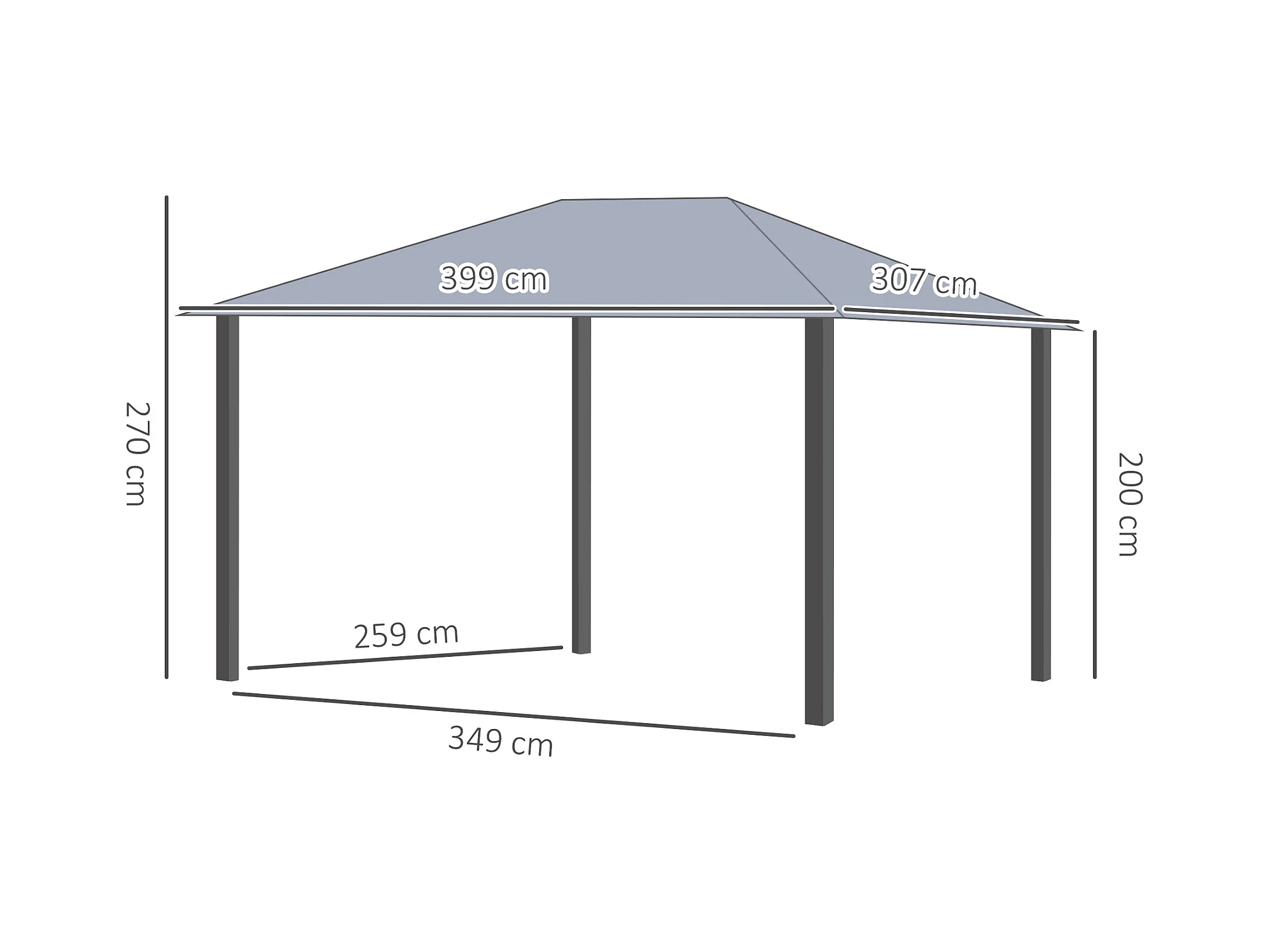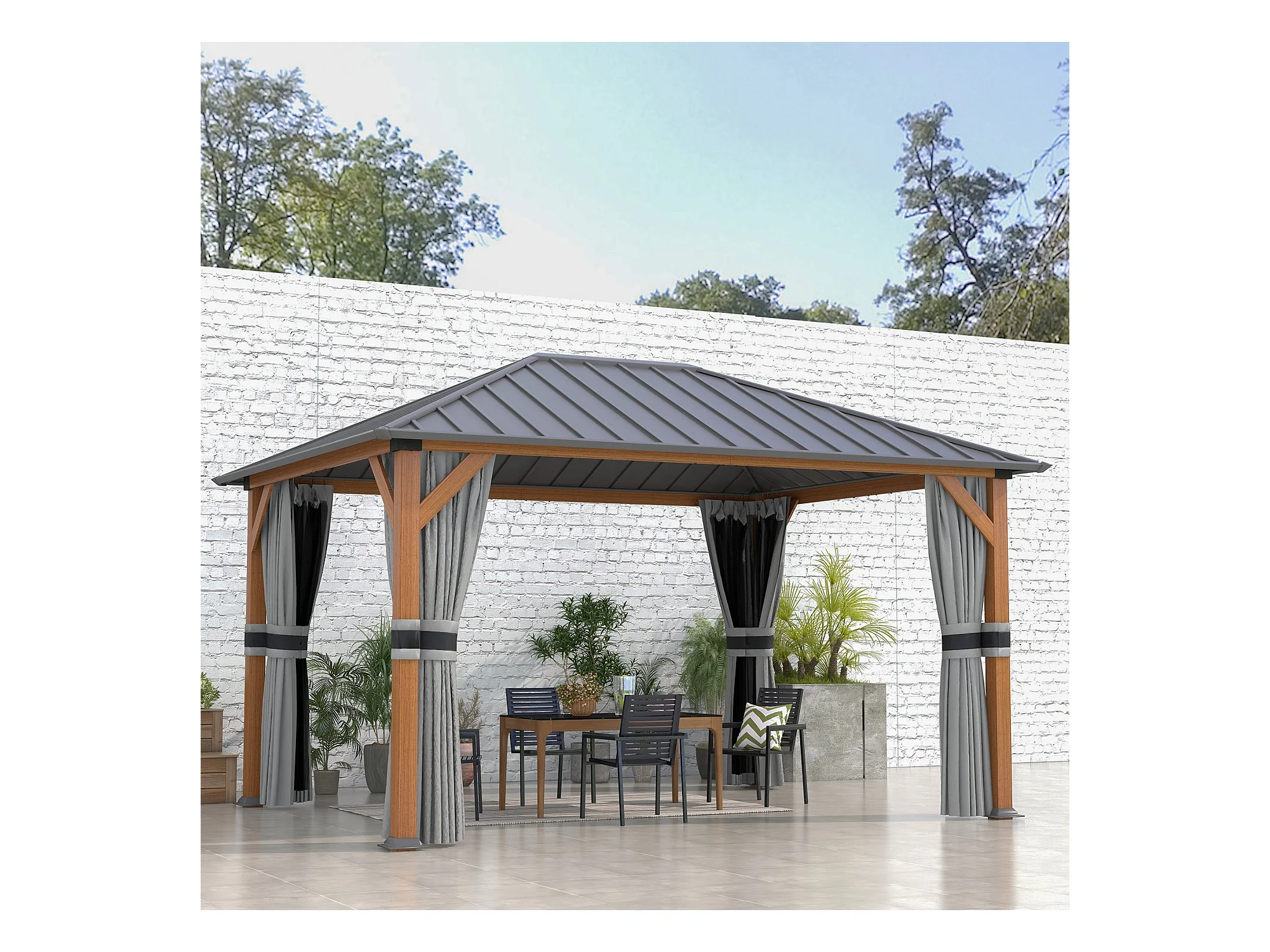 Pavillon de jardin structure alu aspect bois toit rigide métal galvanisé rideaux moustiquaires