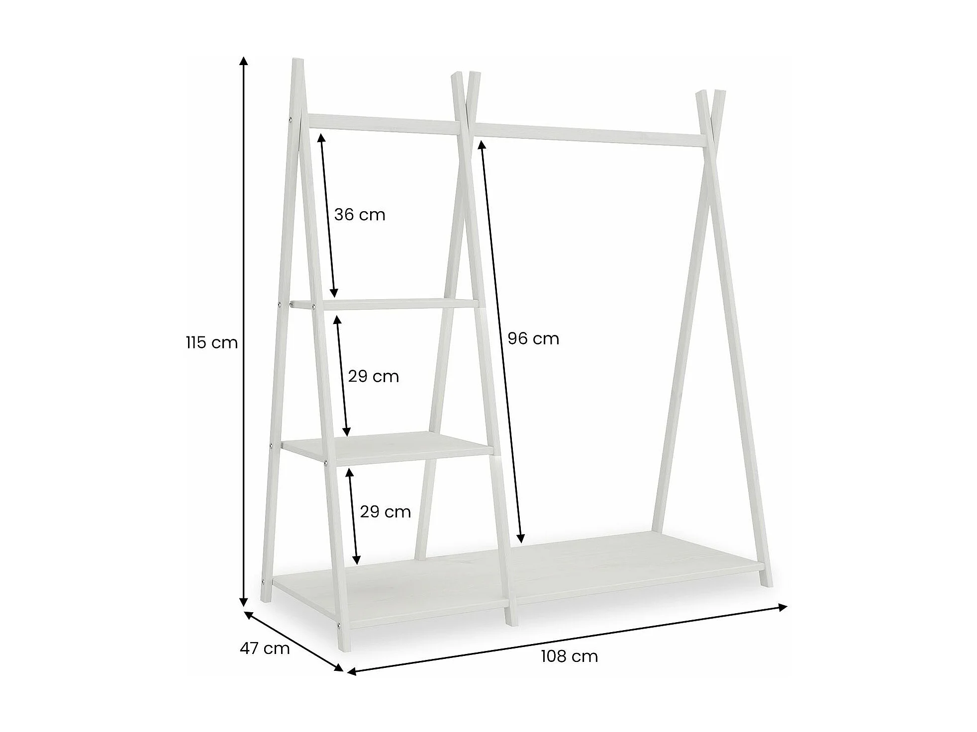 Penderie enfant DANILO avec tringle à vêtements et deux étagères, design tipi, en bois massif, 83 x 115 x 50 cm, blanc