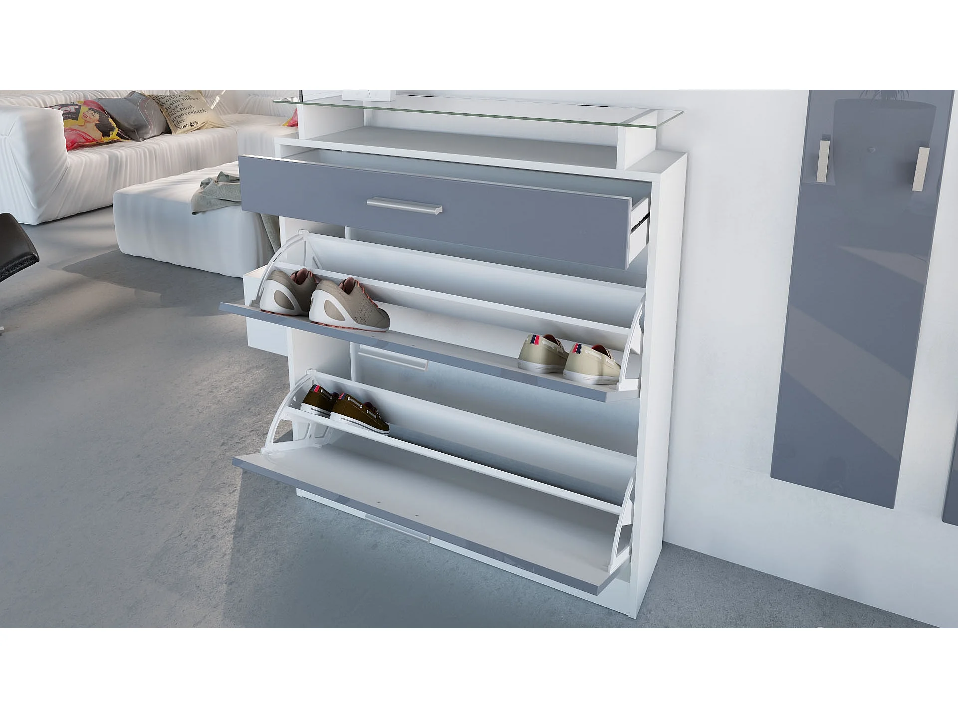 Penderie Loret Mini, Meuble d’entrée comprenant 1 commode à chaussures, 1 miroir mural et 2 panneaux porte-manteaux, Blanc mat/Blanc haute brillance