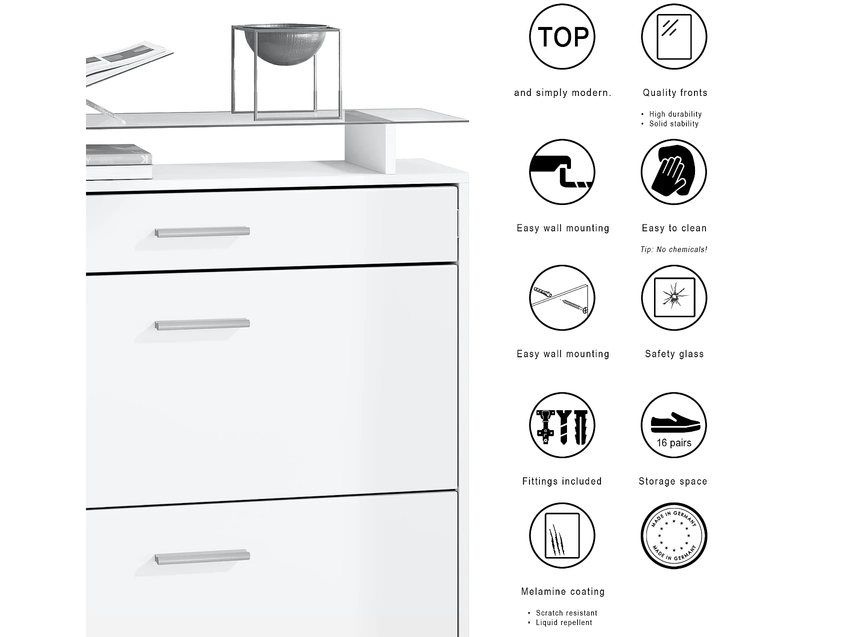 Penderie Loret Mini, Meuble d’entrée comprenant 1 commode à chaussures, 1 miroir mural et 2 panneaux porte-manteaux, Blanc mat/Noir mat