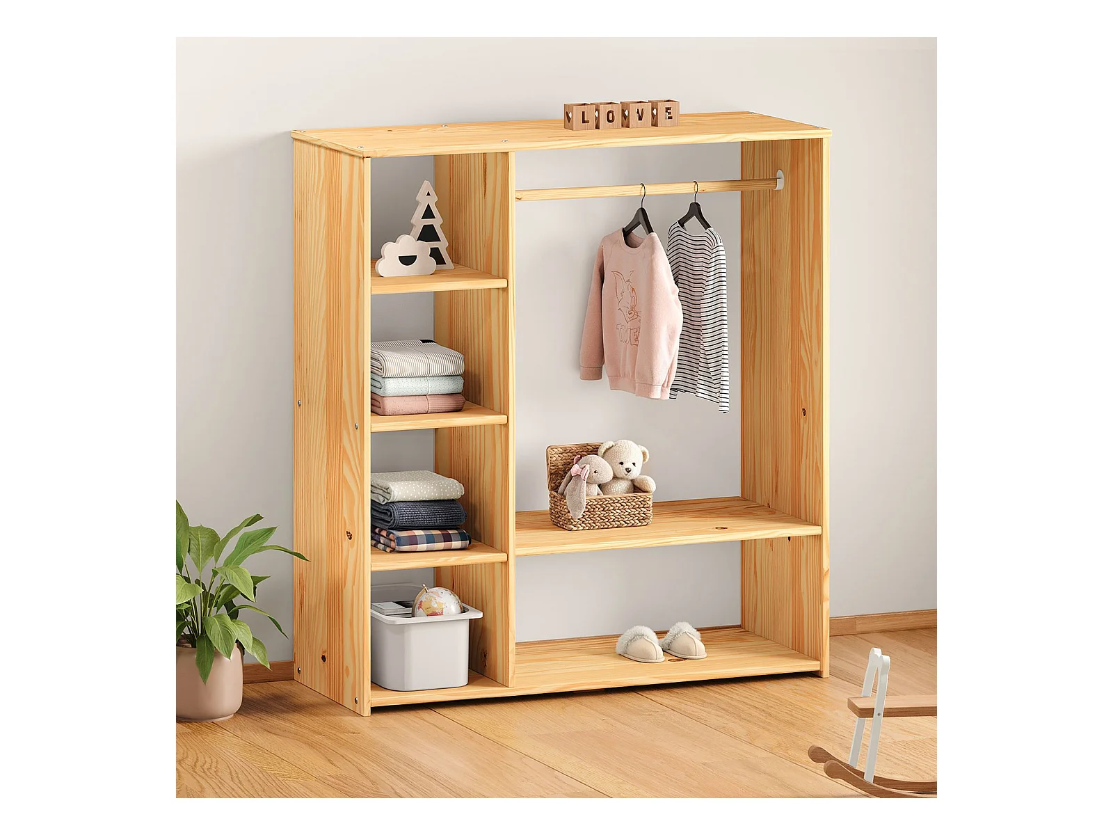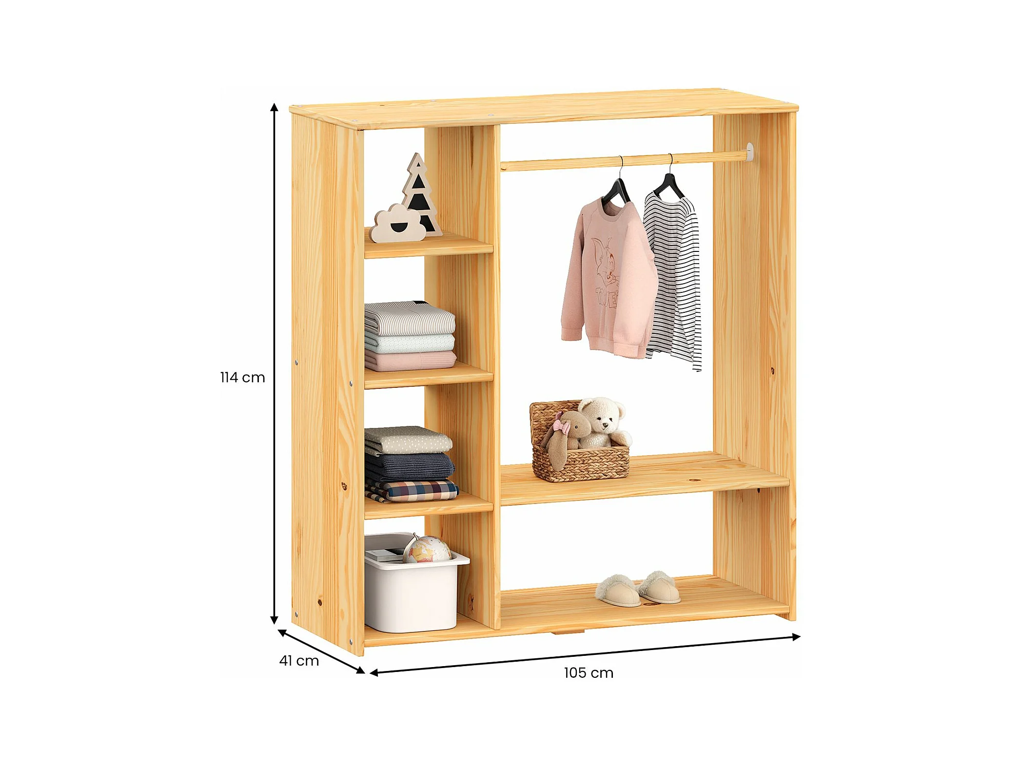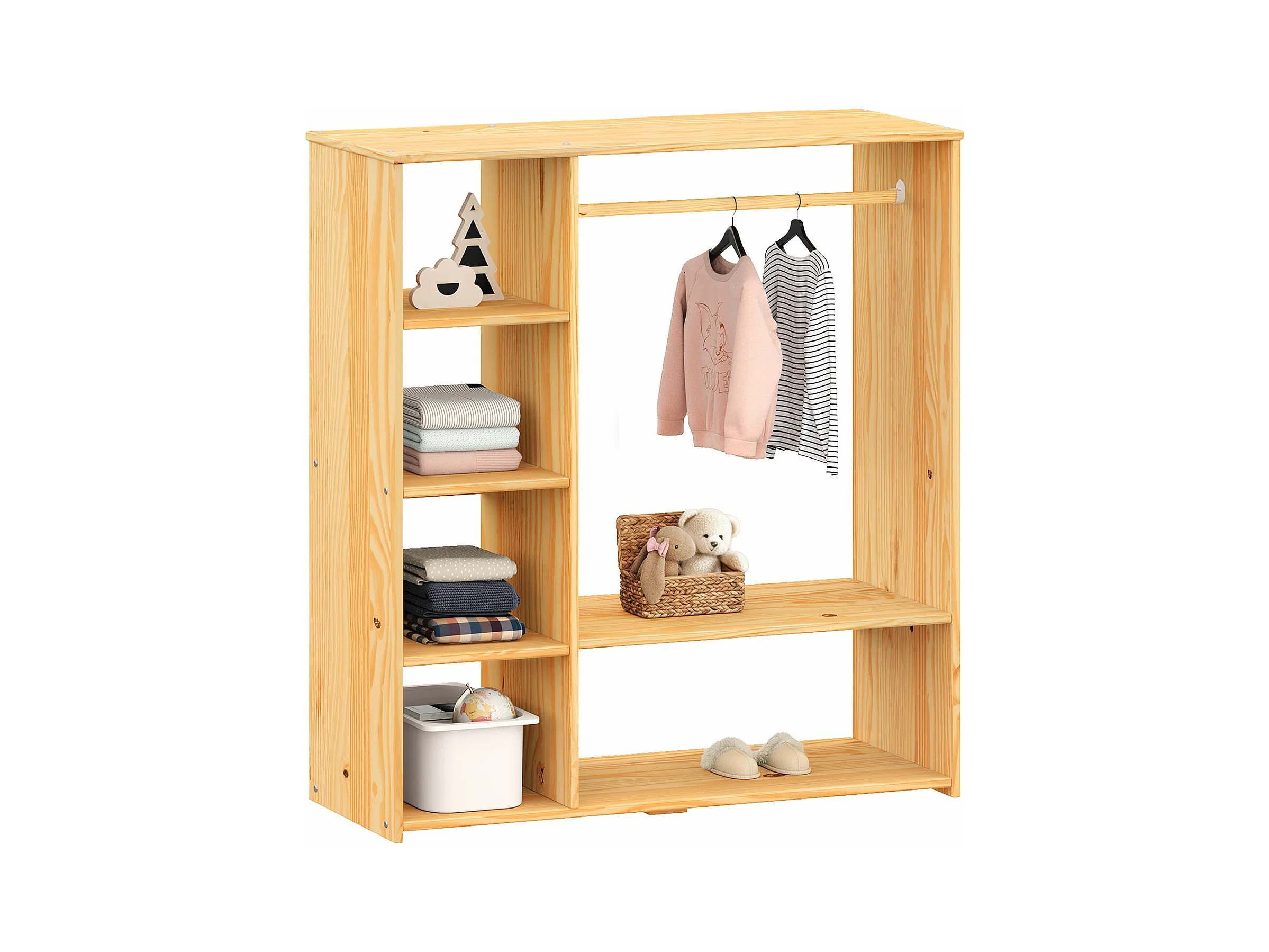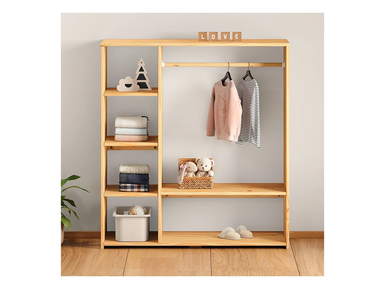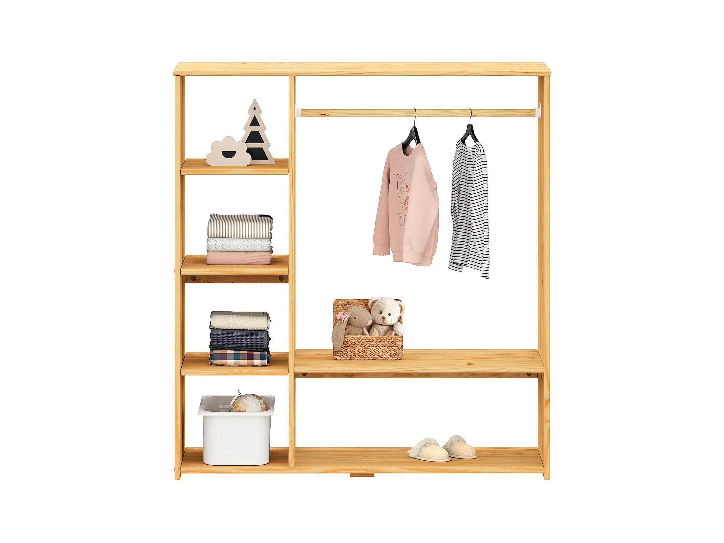 Penderie pour enfant RAFAEL avec étagères en pin massif, portant à vêtements montessori en bois coloris naturel/blanc