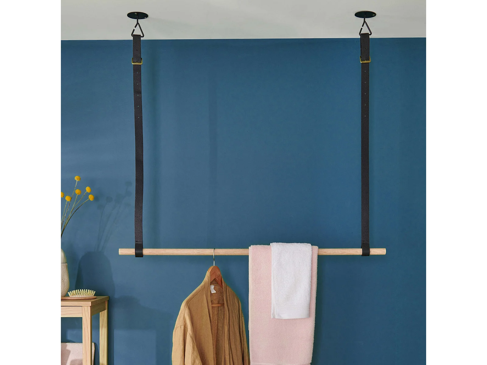 Penderie suspendue bois L100cm noir avec lanières cuir VIKY
