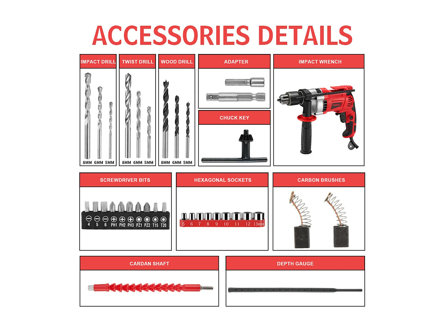 Perceuse à percussion filaire 910W, poignée rotative à 360°,32/13/13 mm