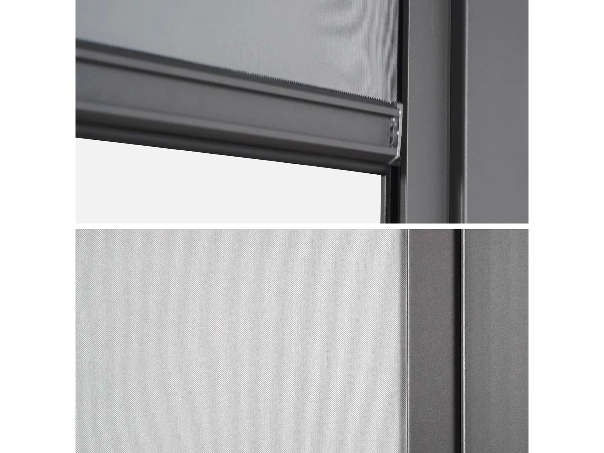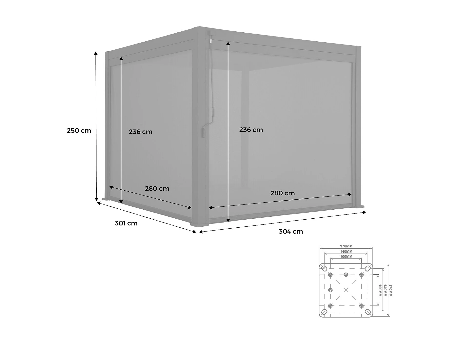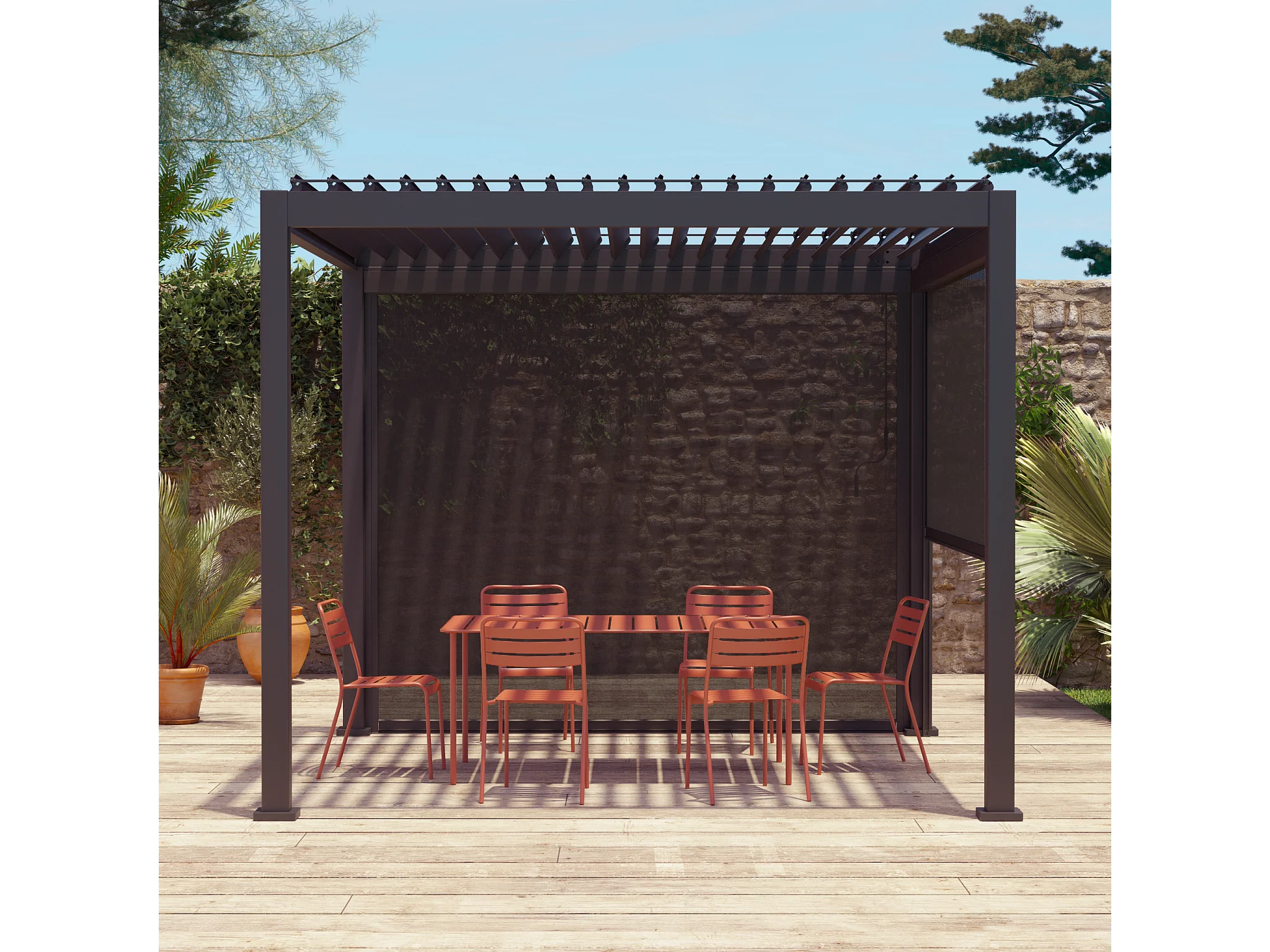 Pergola bioclimatique aluminium Triomphe 3x3 m lames orientables avec 2 stores en aluminium et textilène anthracite