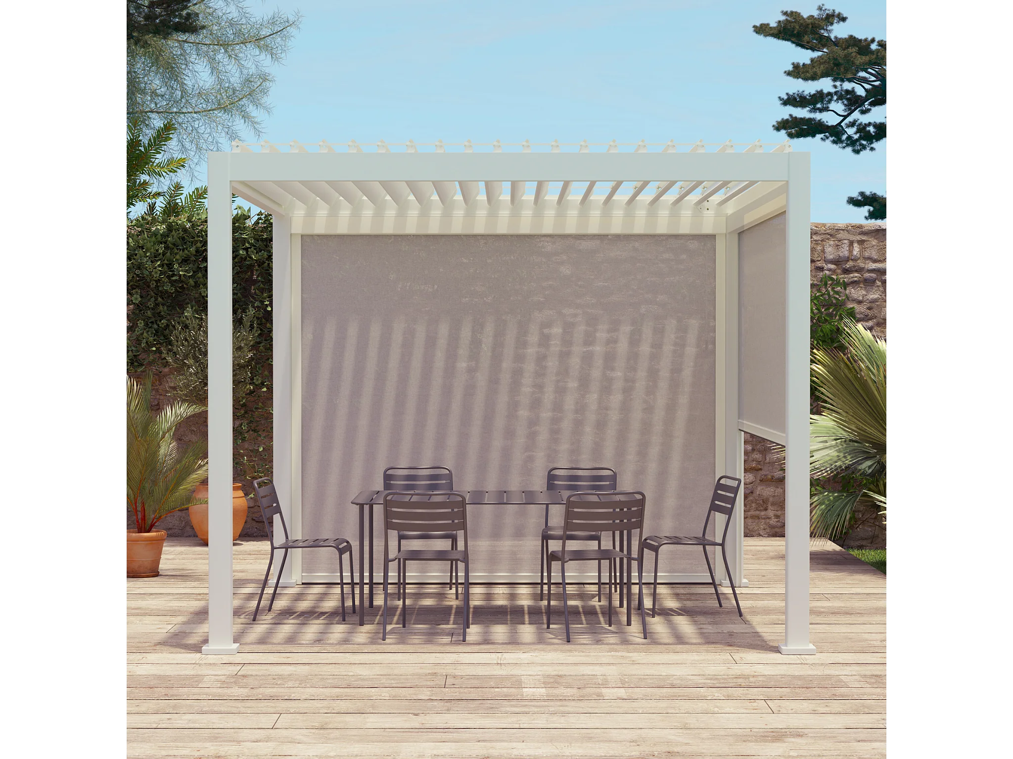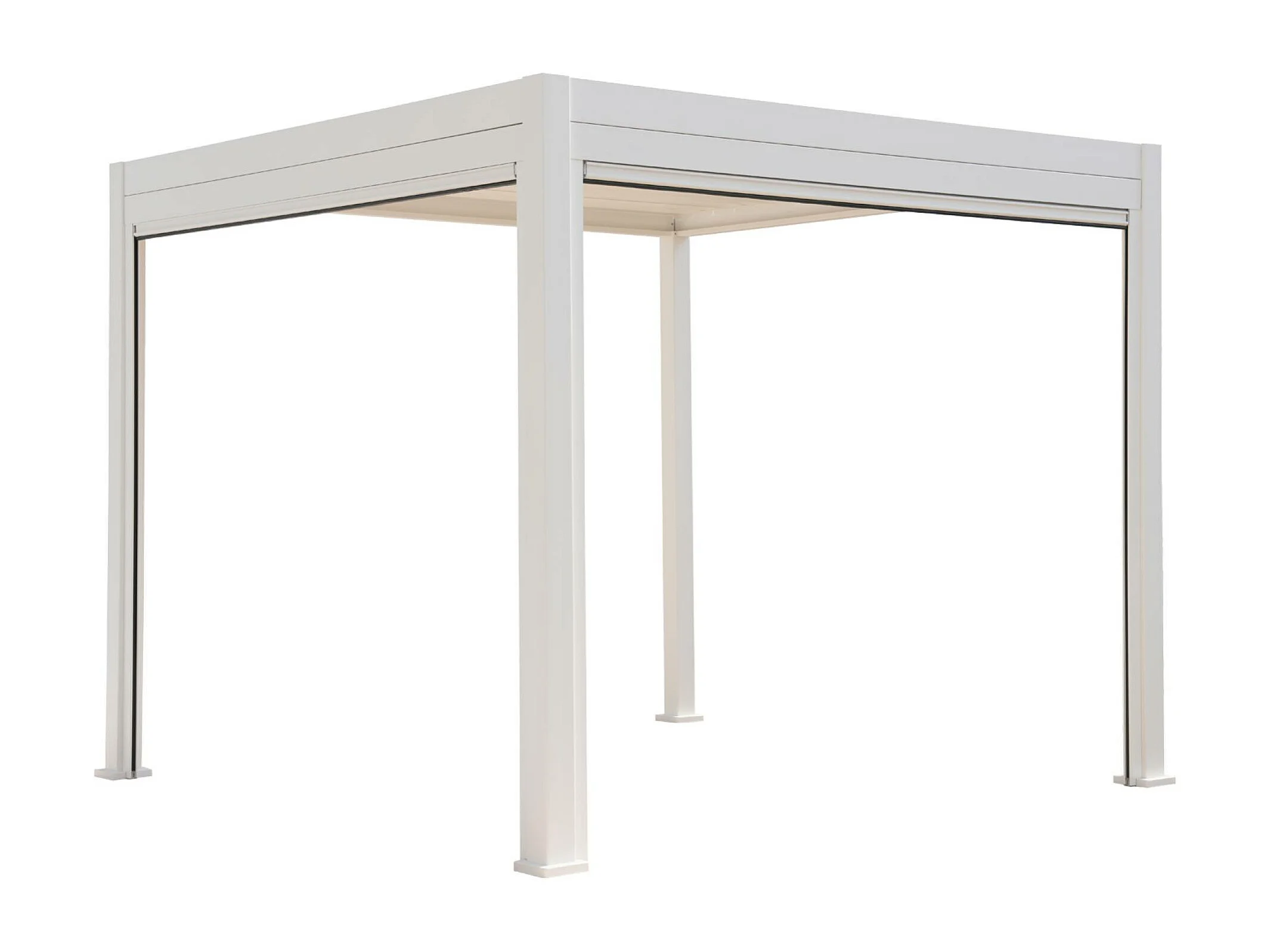 Pergola bioclimatique aluminium Triomphe 3x3 m lames orientables avec 2 stores en aluminium et textilène blancs
