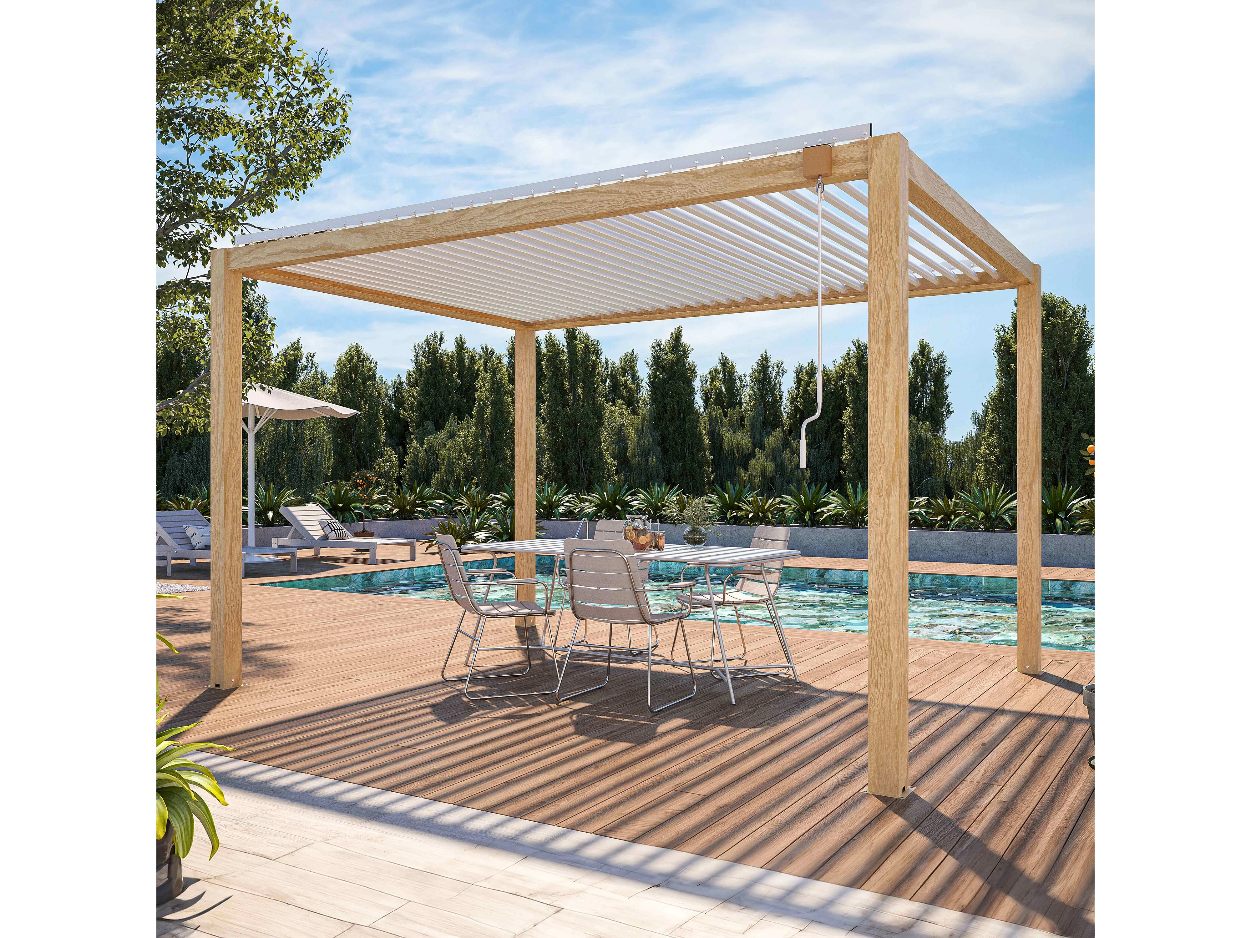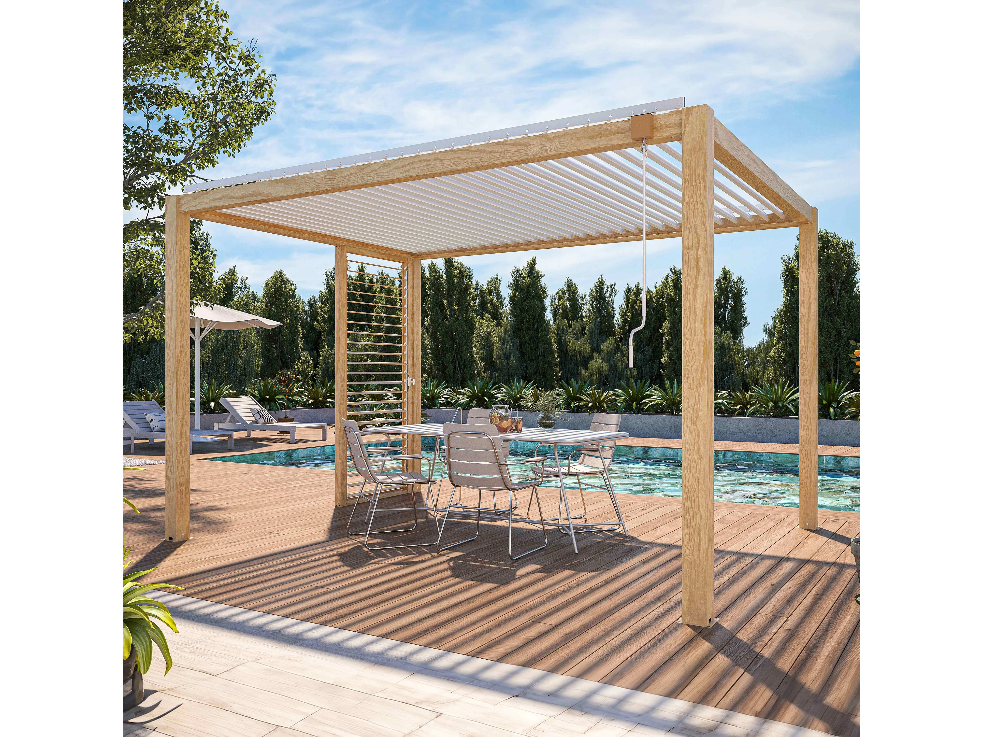 Pergola bioclimatique autoportée 3 x 4m effet bois blanc et 1 claustra