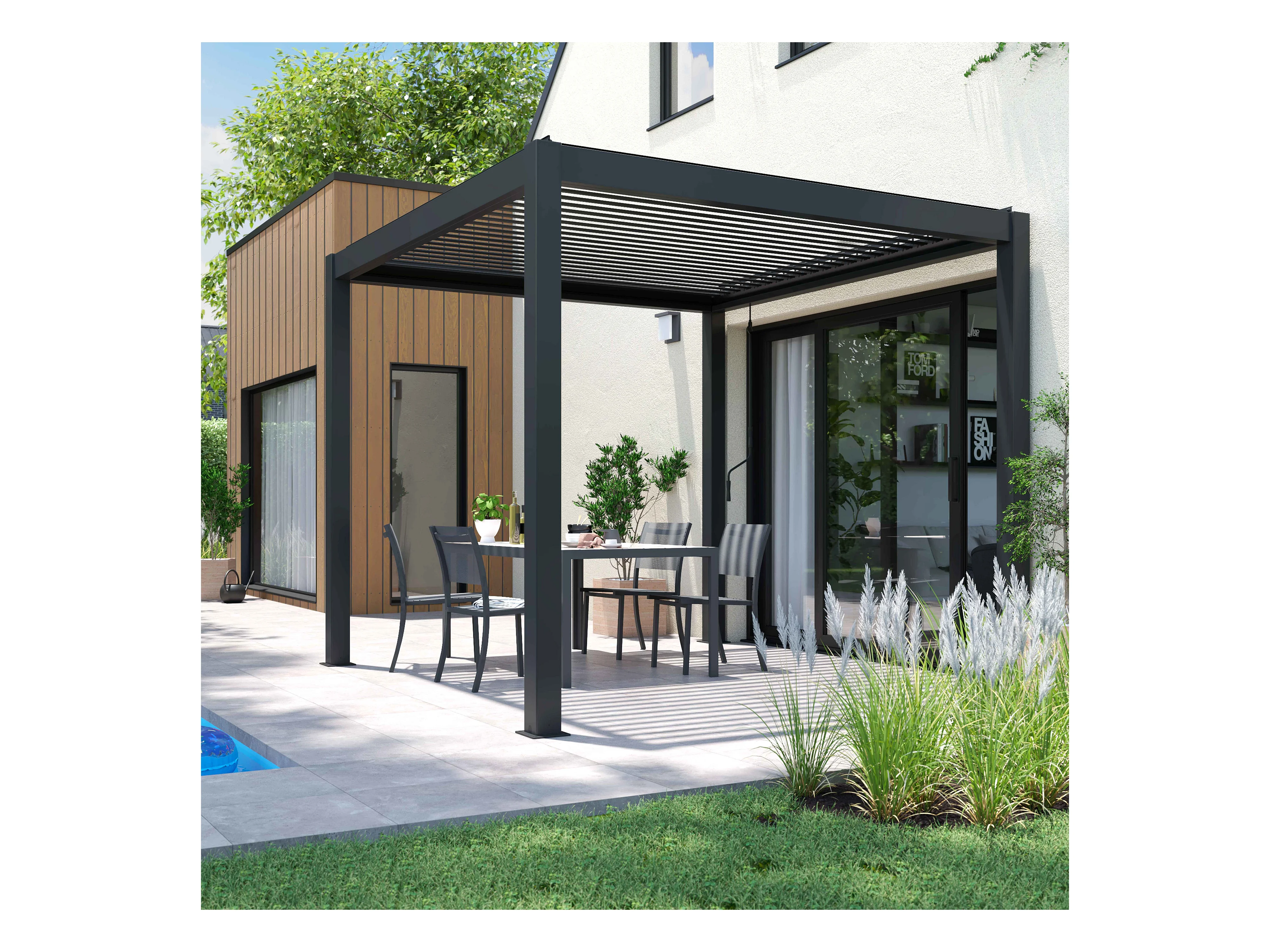 Pergola bioclimatique autoportée 3x3m et 3 Stores 2,66 X 2,34 m