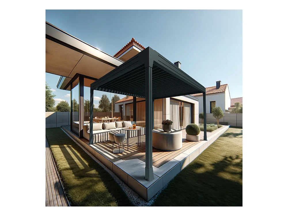 Pergola bioclimatique. aluminium. 3x4m. lames orientables + 3 persiennes verticales 100cm anthracite