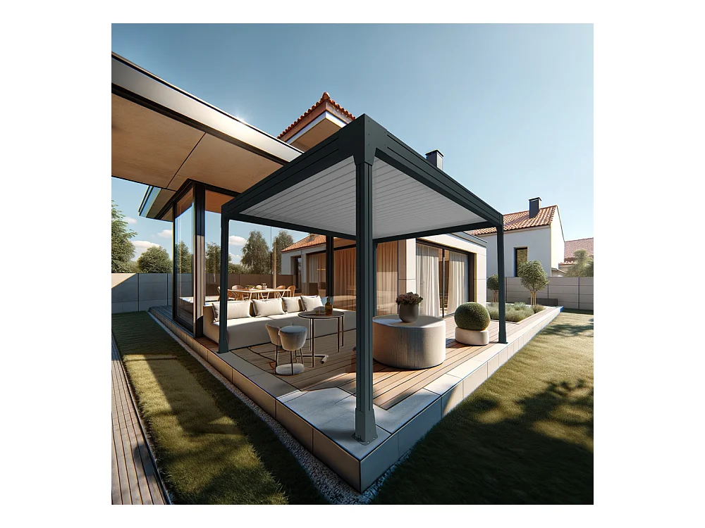 Pergola bioclimatique autoportée motorisée et éclairée 3x4m et 1 store