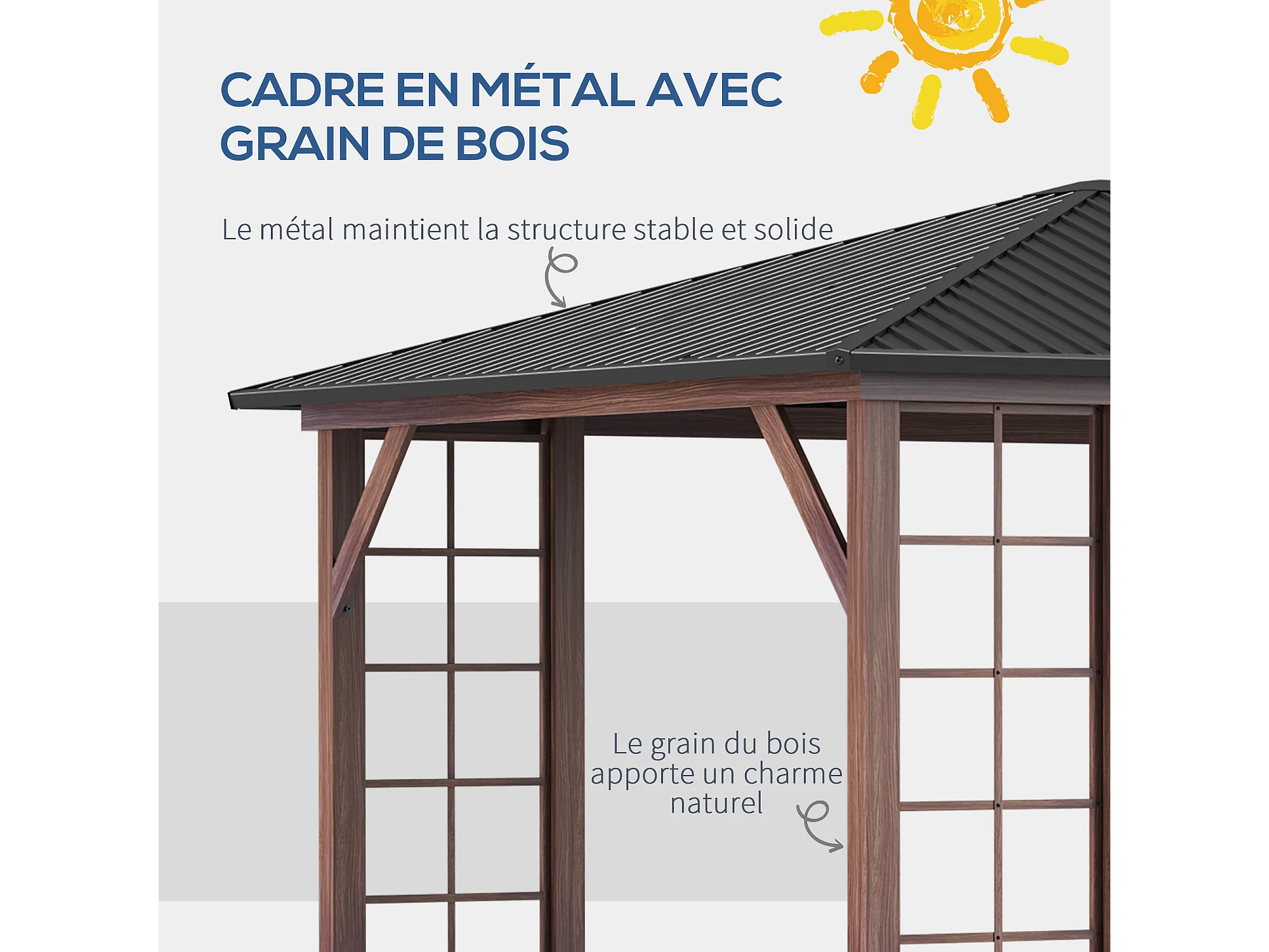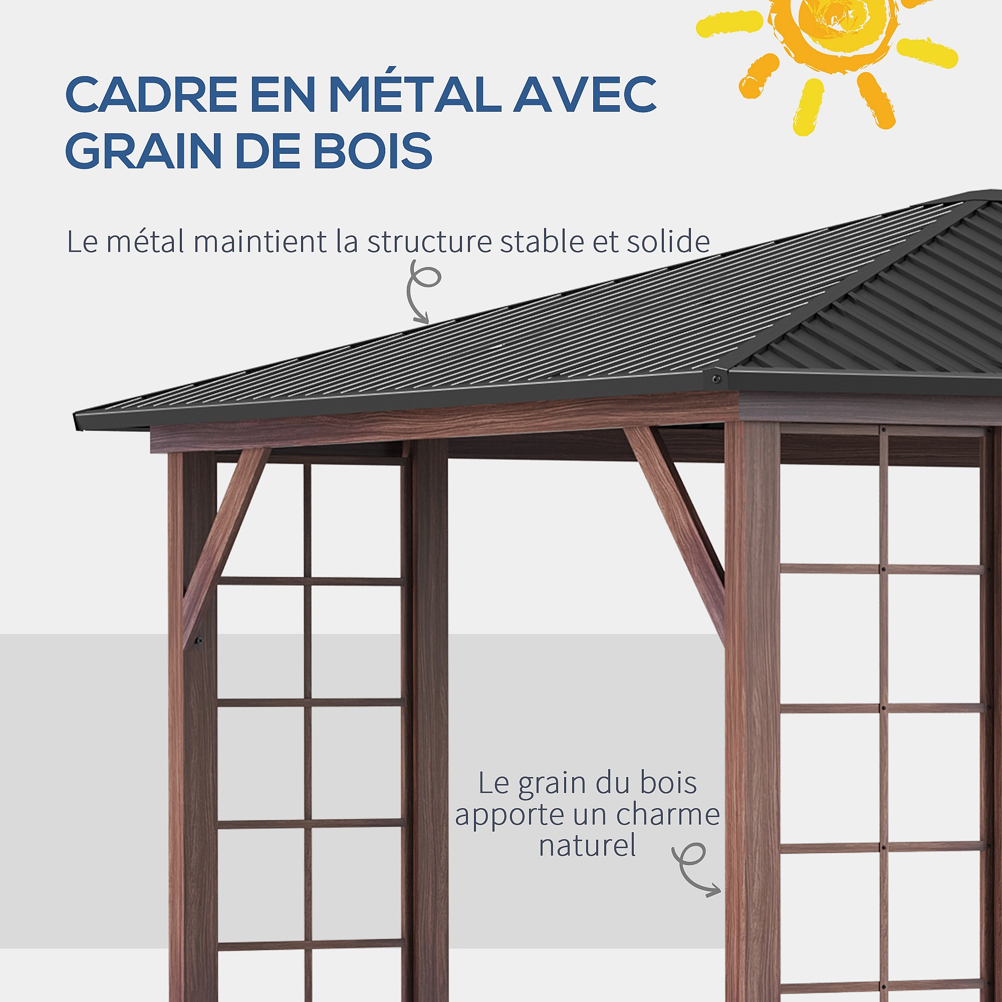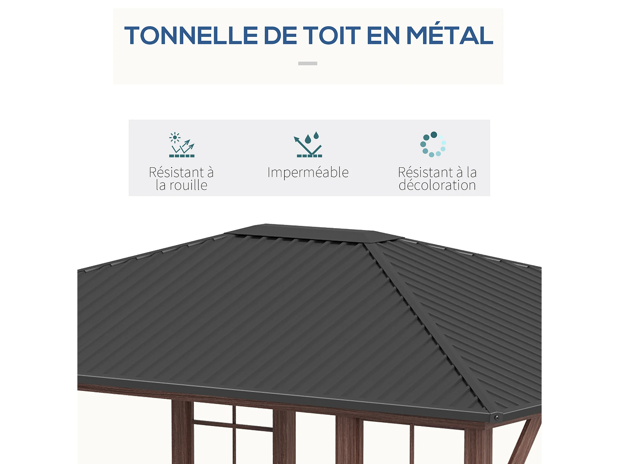 Pergola pavillon de jardin avec toit rigide imperméable - dim. 364L x 299l x 280H cm - métal aspect bois gris foncé