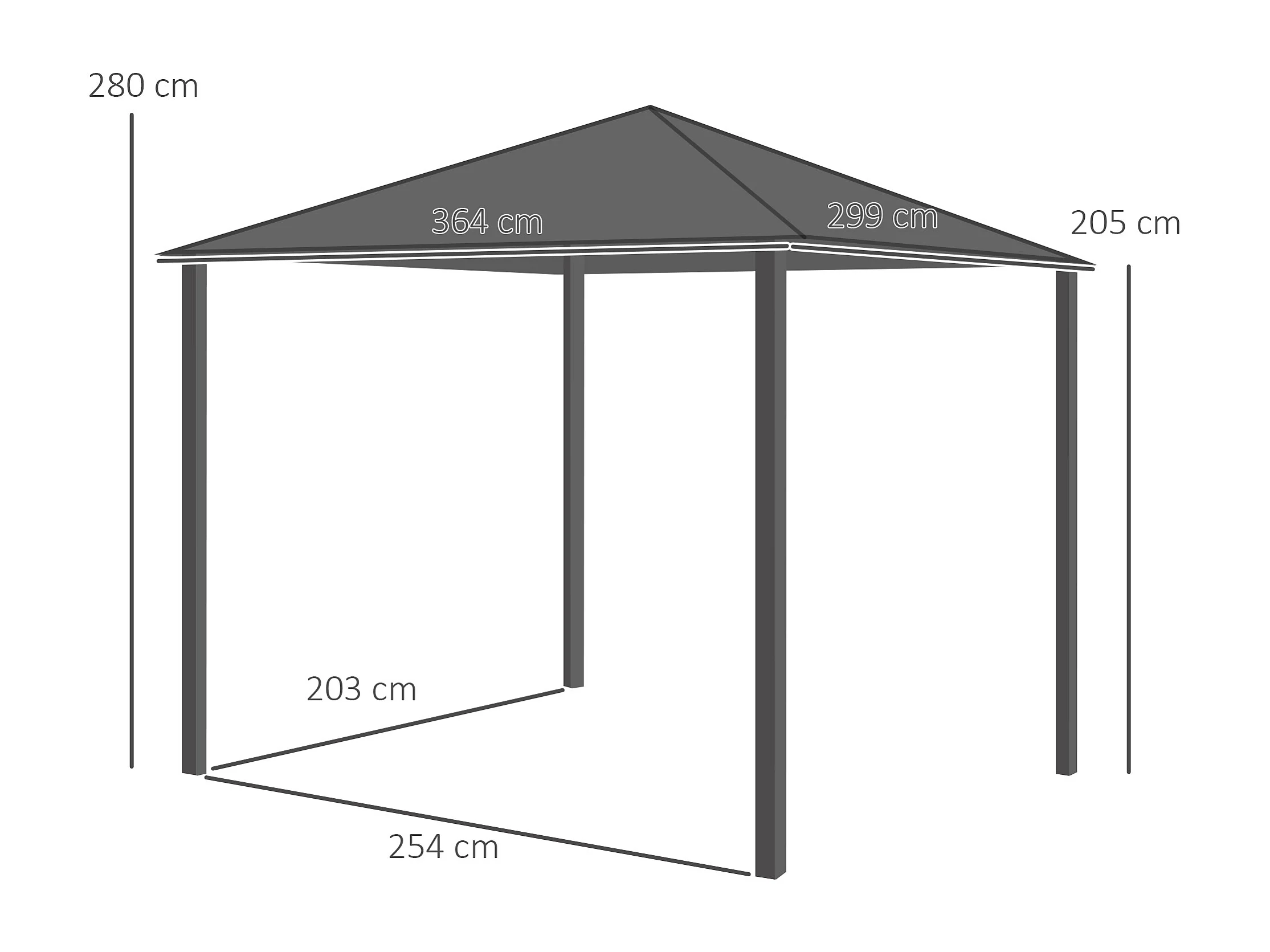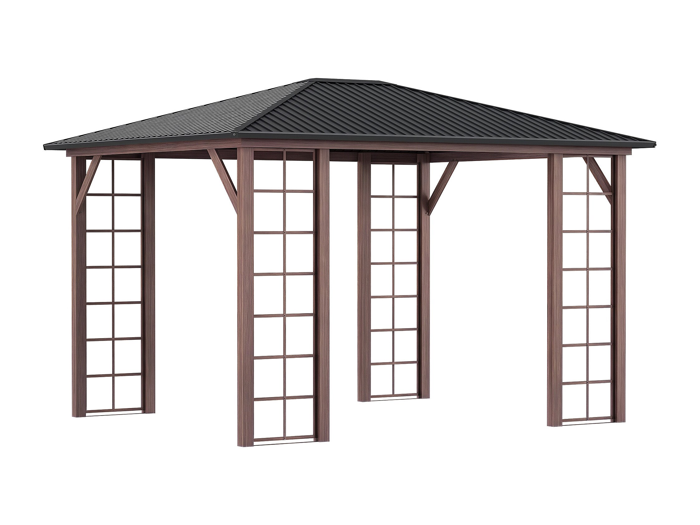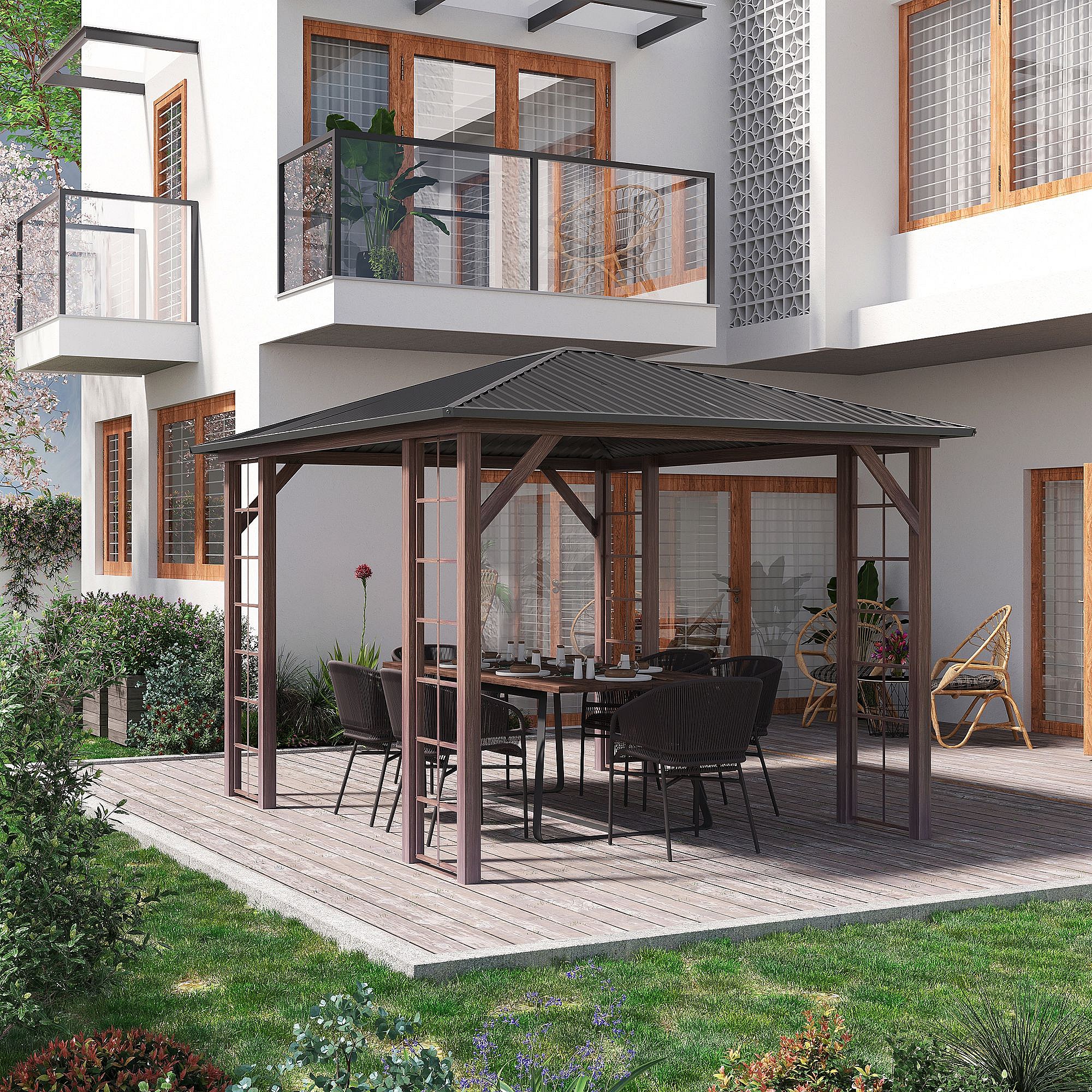 Pergola pavillon de jardin avec toit rigide imperméable - dim. 364L x 299l x 280H cm - métal aspect bois gris foncé