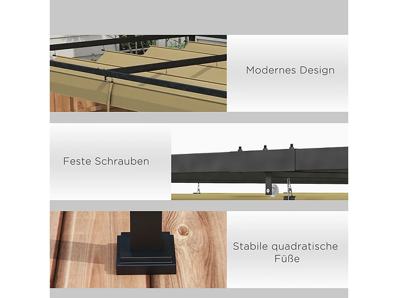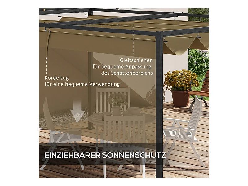 Pergola rétractable 400L x 300B x 222H cm, structure acier inoxydable, toile polyester kaki