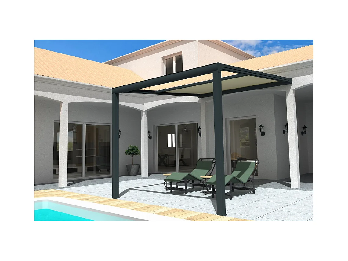 Pergola toile TILA 4,00x3,50m Motorisé à télécommande + manœuvre de secours (Ecru - Gris anthracite)