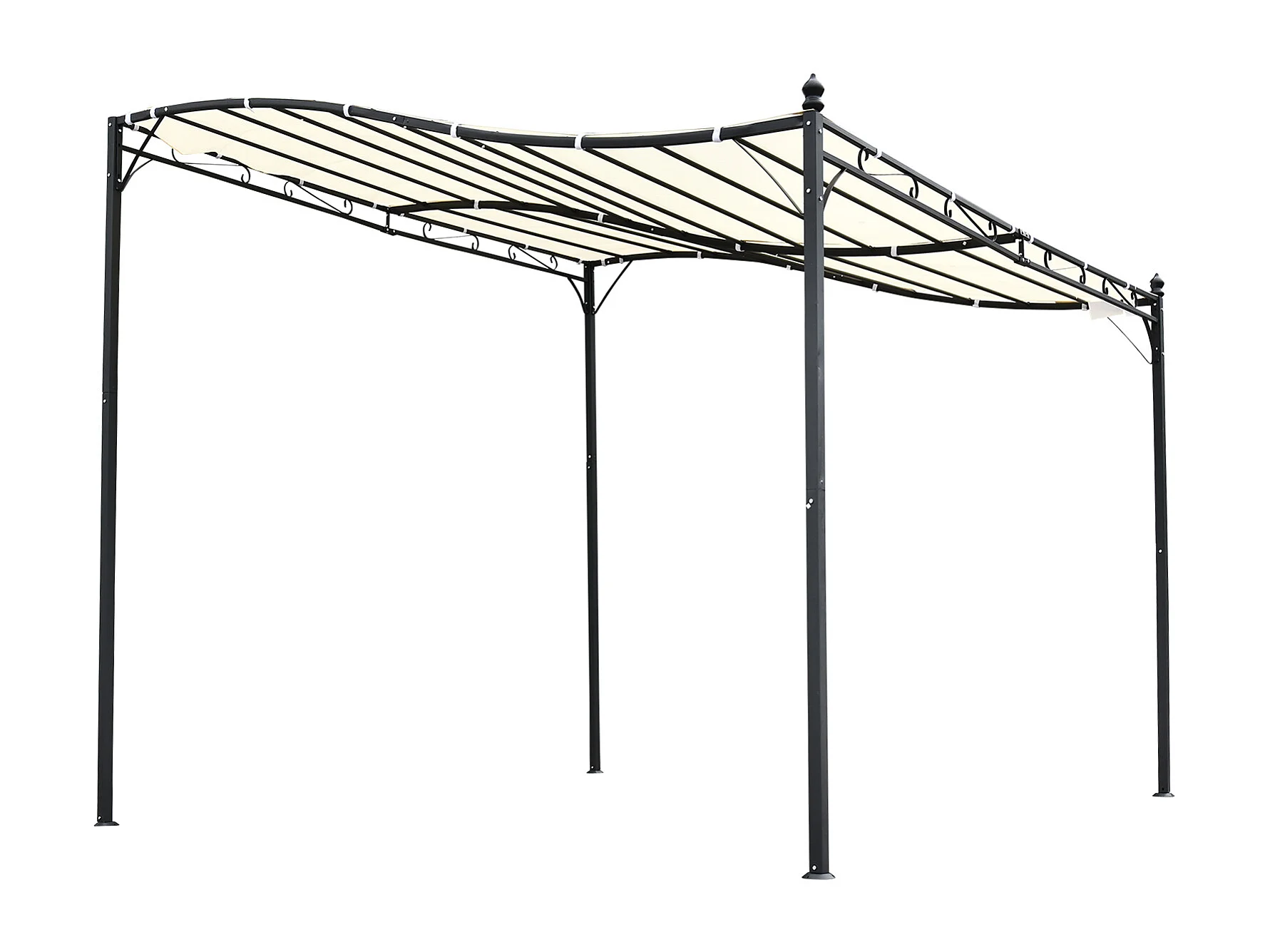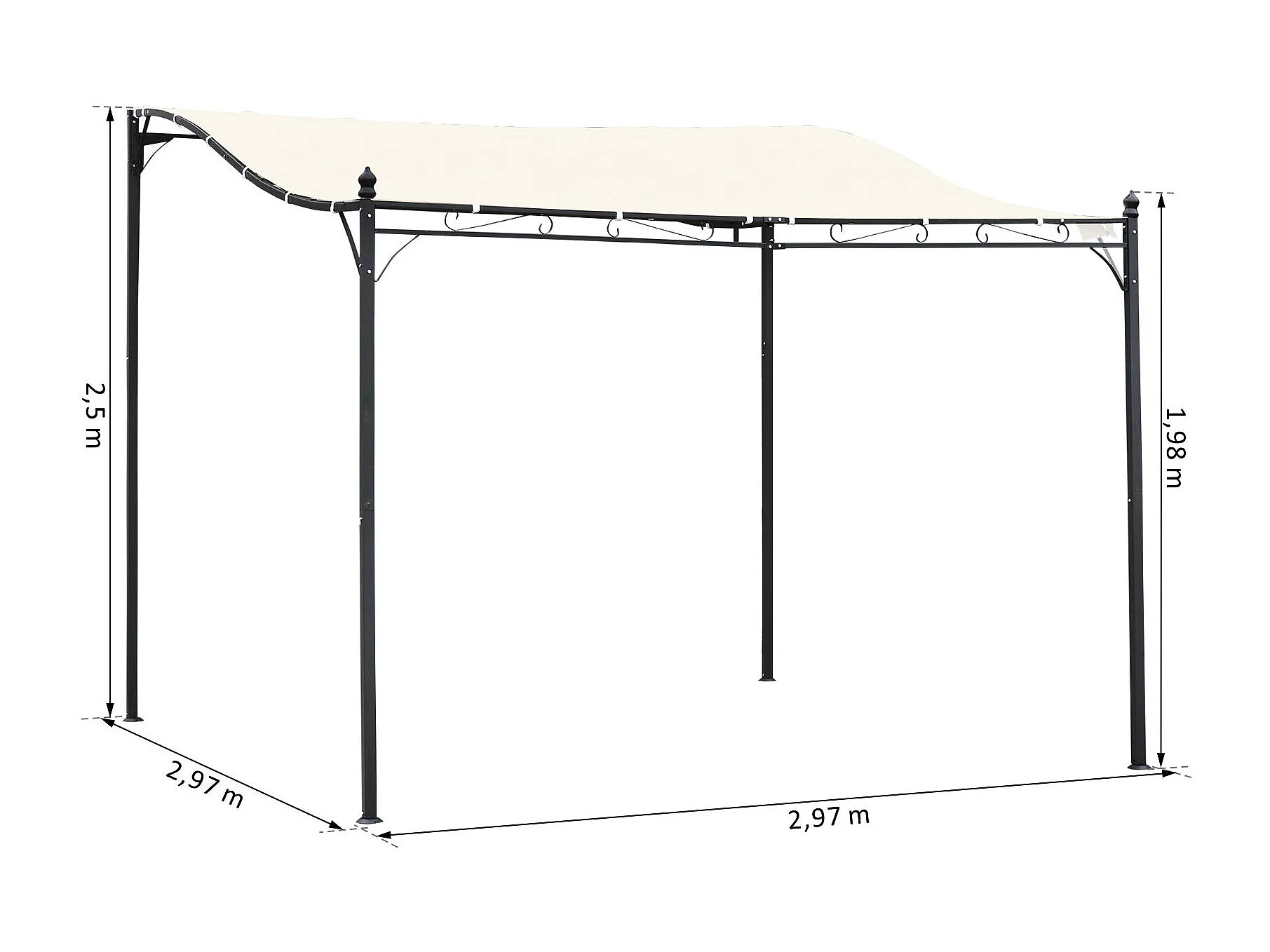 Pergola tonnelle de jardin auvent 2,97 x 2,97 m adossable métal noir polyester anti-UV beige