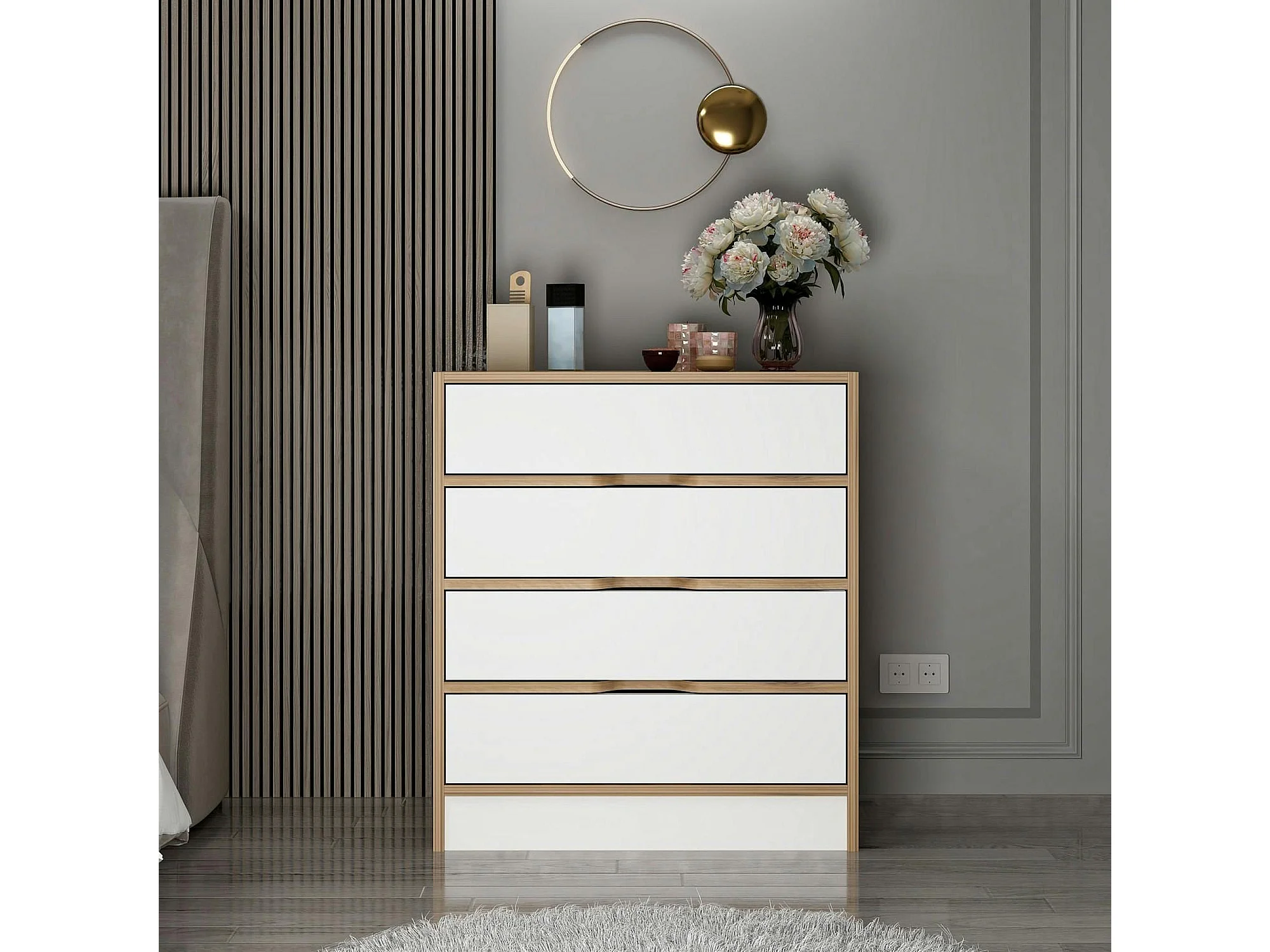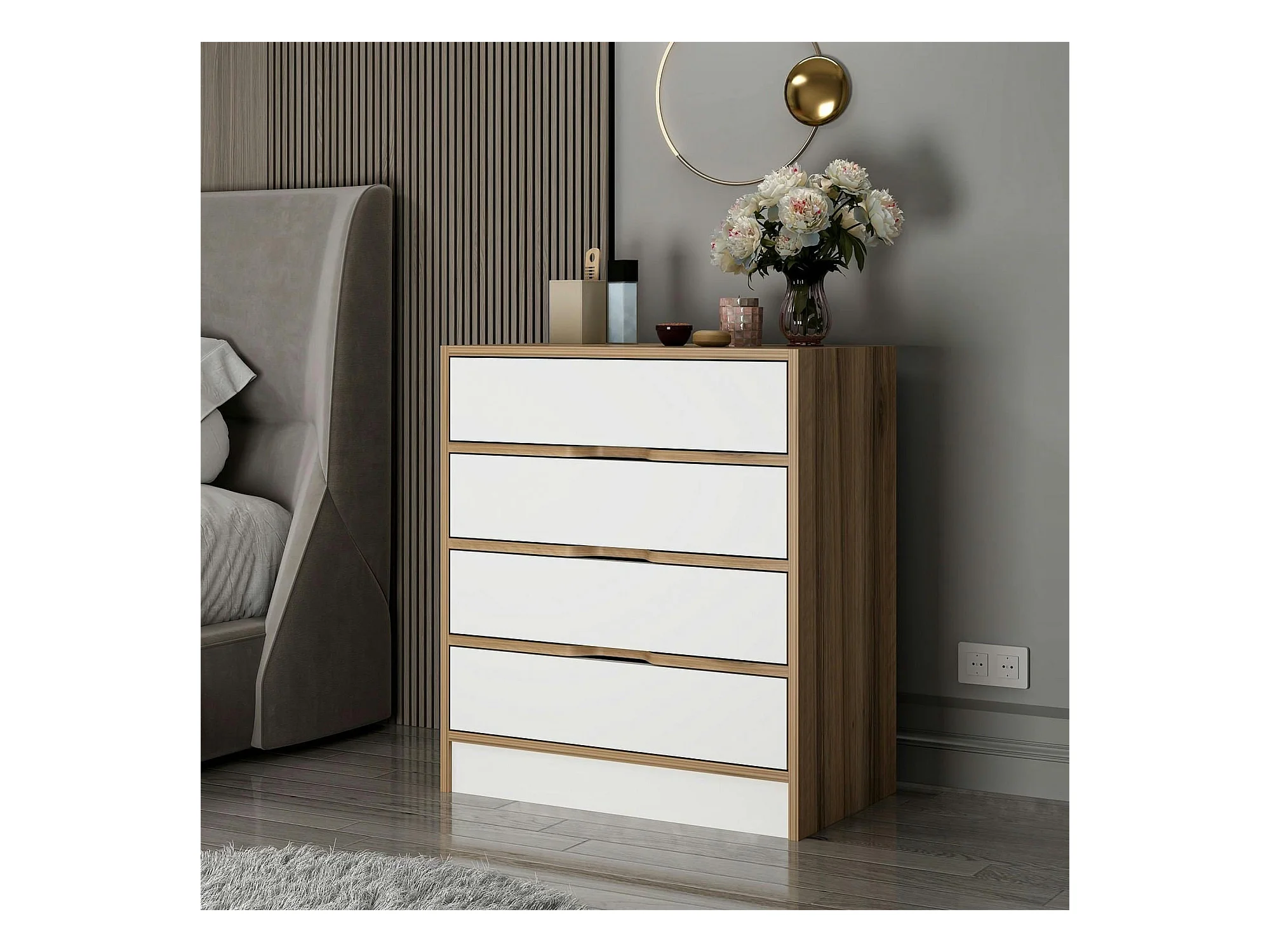 Petite commode moderne 4 tiroirs effet noyer & blanc BYRON
