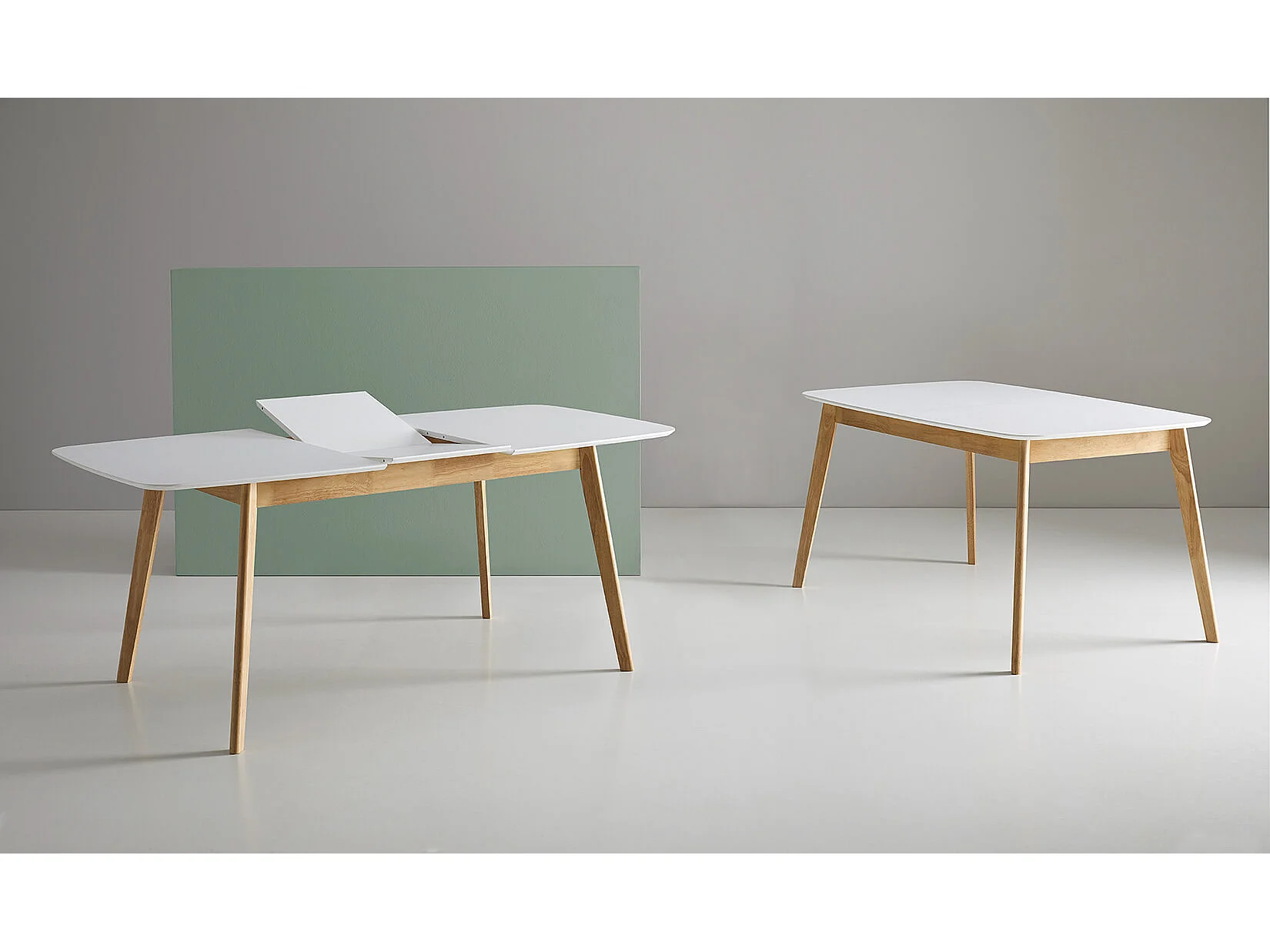 Petite table rectangulaire extensible blanc brillant et pieds naturel Askin 120 à 150cm